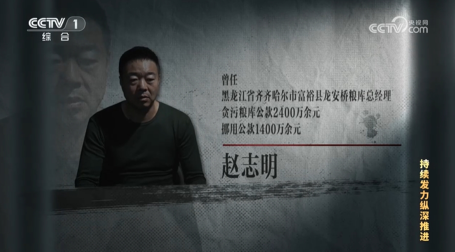 【解说词】赵志明曾是黑龙江省齐齐哈尔市富裕县龙安桥粮库总经理,经查,他贪污粮库公款2400万余元,挪用公款1400万余元,2023年3月被判处有期徒刑14年。龙安桥粮库是在2015年由5家国有粮库改革重组的,富裕县政府持股51%、民营企业鼎仓公司持股49%。赵志明原本是鼎仓公司的老板,在这次改制中当上了龙安桥粮库总经理。