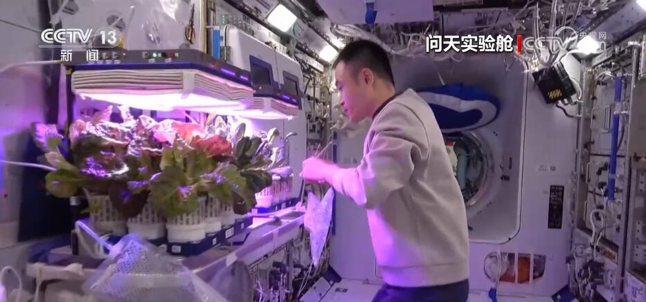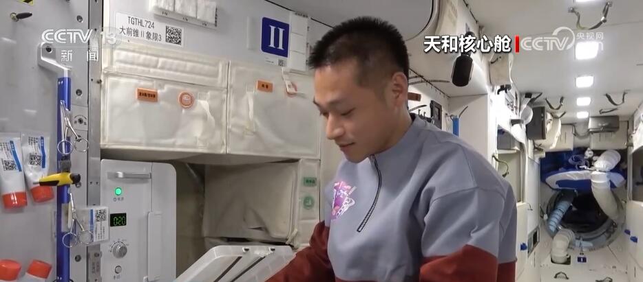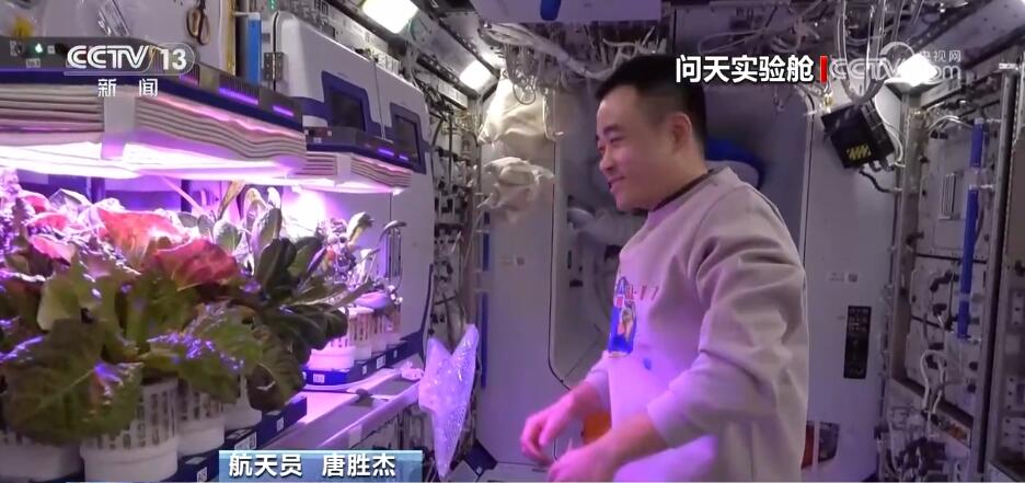 航天员 唐胜杰:你好,我正在对我们的樱桃番茄进行授粉。因为太空没有小蜜蜂,我就是那只小蜜蜂。大家看一看,这是我们的太空蔬菜,神十七乘组在“太空出差”期间,我们的太空菜园变得更大了,大家看看我们的蔬菜是不是长势喜人?今天是新年的第一天,江新林为我们准备了营养丰盛的太空午餐,但是我觉得今天应该再增加一点绿色的、新鲜的蔬菜,午餐就会变得更丰盛了。大家可以看一看,看看我们的樱桃番茄。诶,拿这两杯,今天中午我们就吃这两杯。