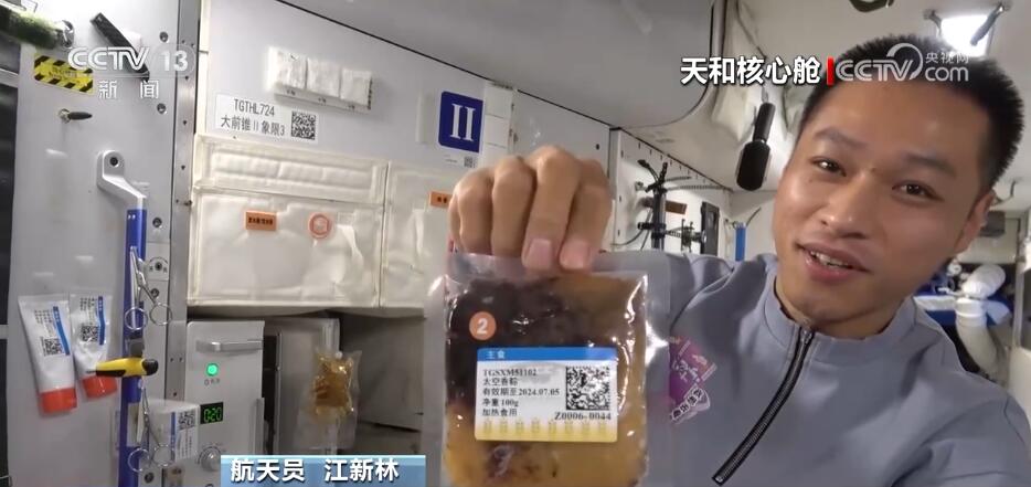 航天员 江新林:我是今天的太空美食家,让我带领大家一起来探索发现今天的太空美食。我们先看一下主食,热乎乎的,看看里面都有什么吧,有01最爱吃的白米饭,小心烫哦,02爱吃的面条,我的炒饭。好了,把它粘在餐桌上。然后再让我们看看我为他们准备的惊喜。看看这是什么?这是我们冬至特意结余的饺子,还有蔬菜副食。地面上的工作人员考虑得特别周到,按照个人的口味为我们准备了美味的食品,而且将它们塑封包装,给我们节余时间的时候又保证它的口味。这是网红太空香粽,大家印象比较深刻吧,还有这个年糕也是特别好吃、特别美味,还有红烩猪排,保证有足够的蛋白质摄入量。很丰盛。请看这里,我们特意留了一些新鲜的水果,看看都有什么吧,有美味的苹果,还有葡萄,大家这个都特别爱吃,我们三个在一起分享一下。