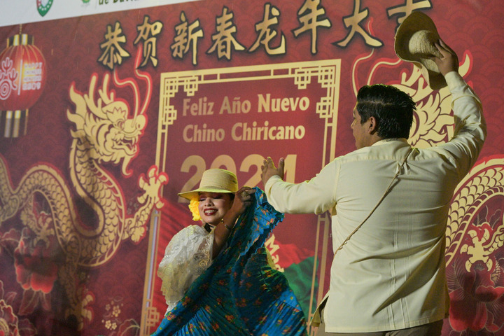 2月17日,在巴拿马奇里基省首府戴维市,两名身穿巴拿马民族服饰的舞者在奇里基春节庆祝活动上表演。新华社记者陈昊佺摄