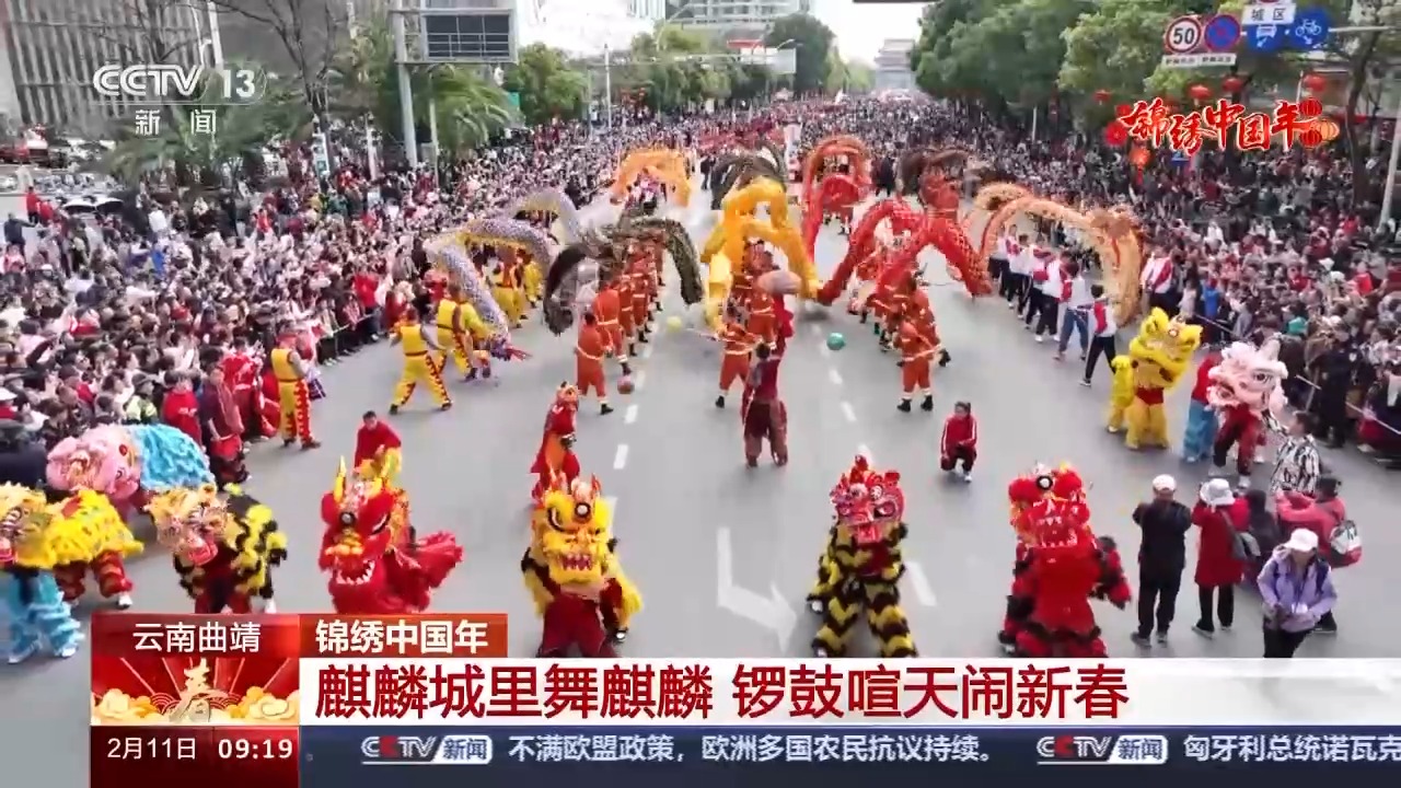 总台记者 刘文杰:麒麟祥瑞降人间,龙腾四海贺新春。我现在所在的位置,就是麒麟区千人舞麒麟活动的现场,现在,30支参与表演的队伍都已经在这里完成集结,大家身穿各式麒麟服,头戴麒麟面具,大家会从这里出发,沿着城市主干道,进行路演和驻停表演。