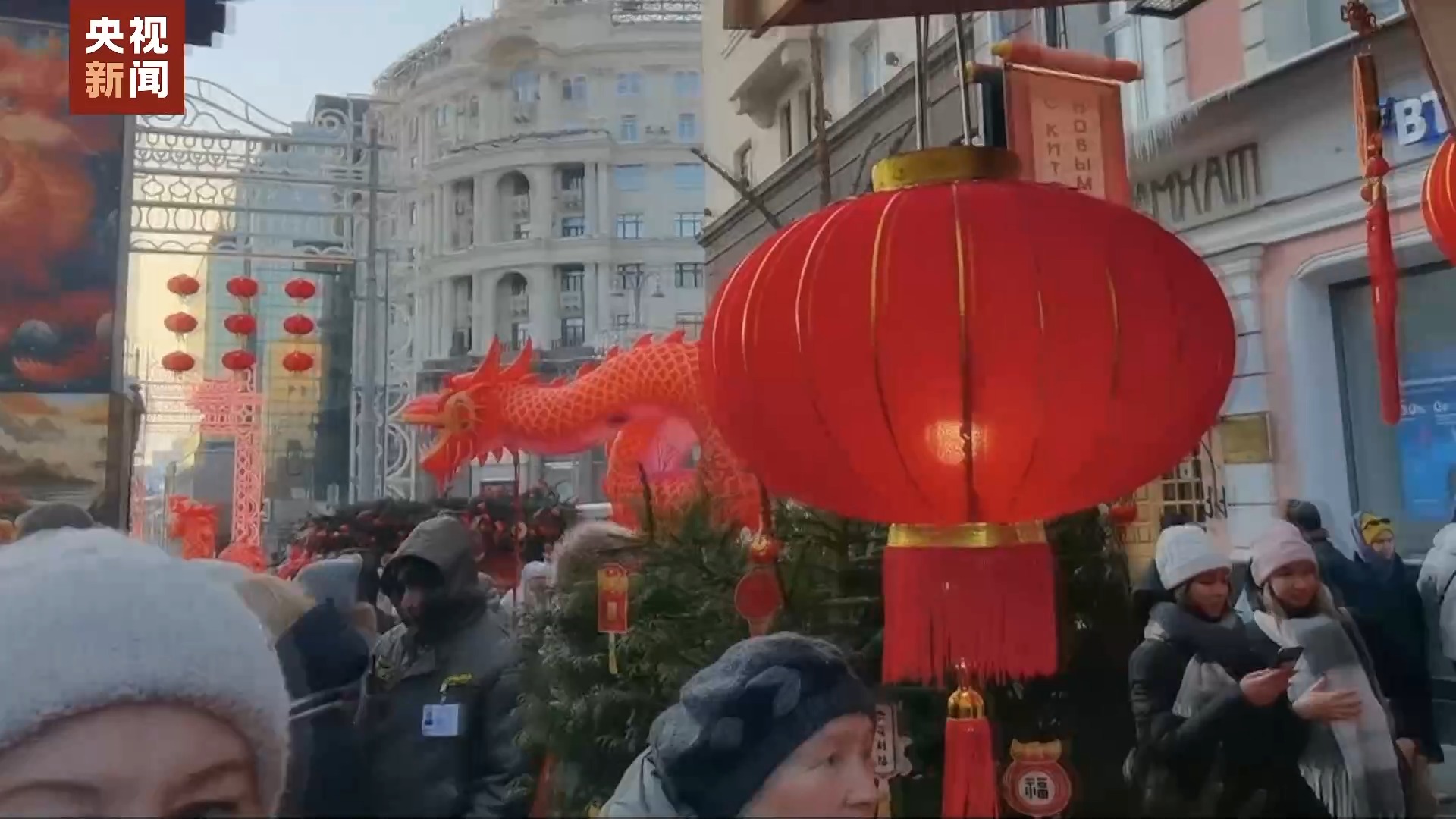 总台记者 王新俊:这里是俄罗斯首都莫斯科卡梅尔格尔斯基巷,中国农历春节的大年初一,包括这条巷子在内,一些莫斯科主要街道张灯结彩,欢庆中国新年。