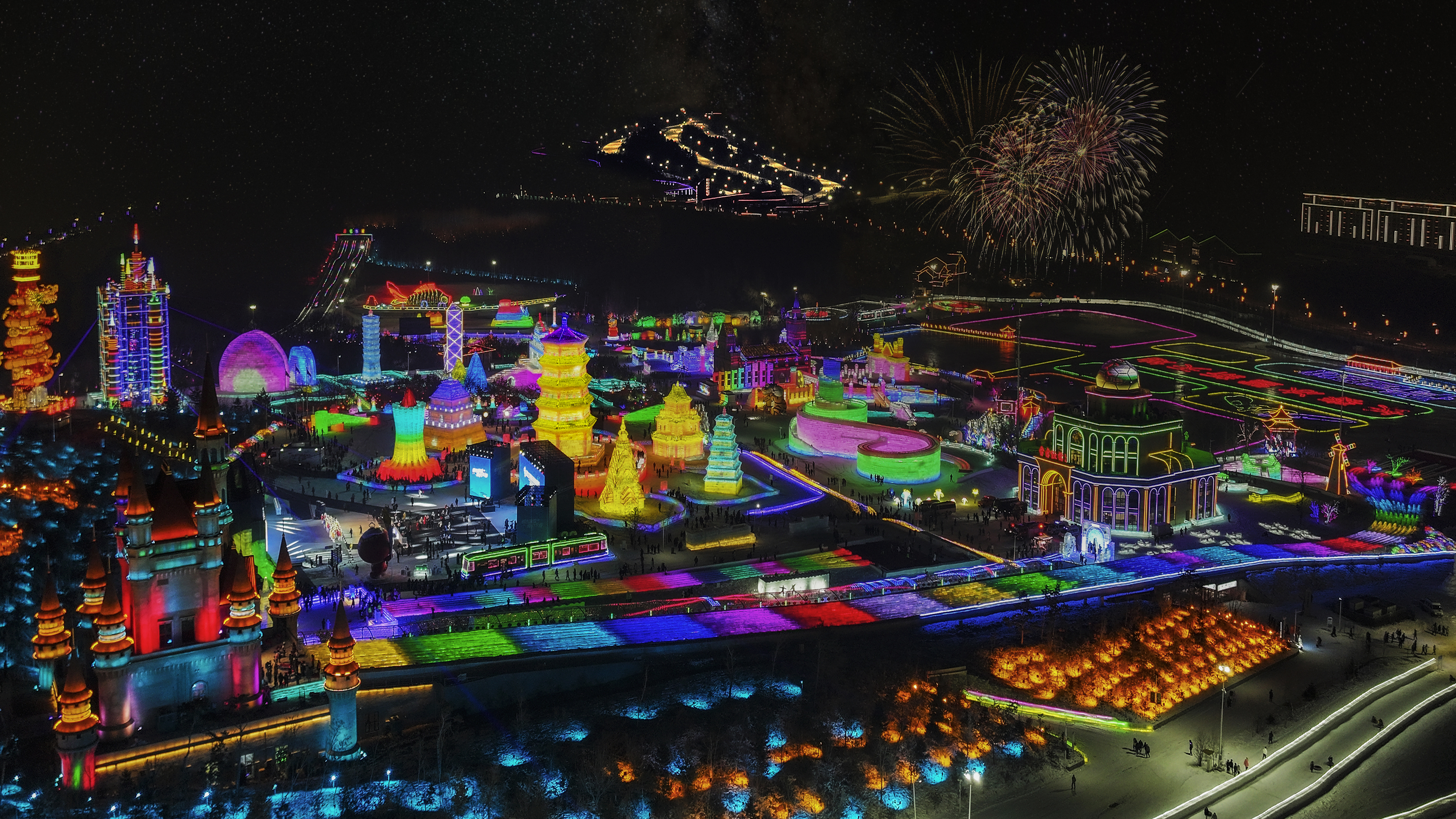 从白天到夜晚,园区里的春节节目接连上演:舞龙舞狮、秧歌队、萨满表演;大大小小的16条冰雪滑梯,满足不同人群游玩需求;单腿驴、小冰车、抽冰嘎……仅需一块冰面,就可以享受到东北最简单的快乐。夜晚灯光点亮,暴风雪派对、大型烟花秀将节日气氛拉到最高值。