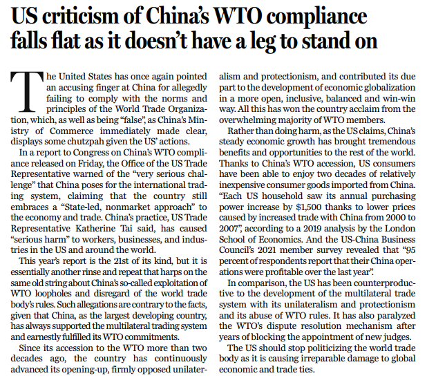 原标题:US criticism of China's WTO compliance falls flat as it doesn't have a leg to stand on
