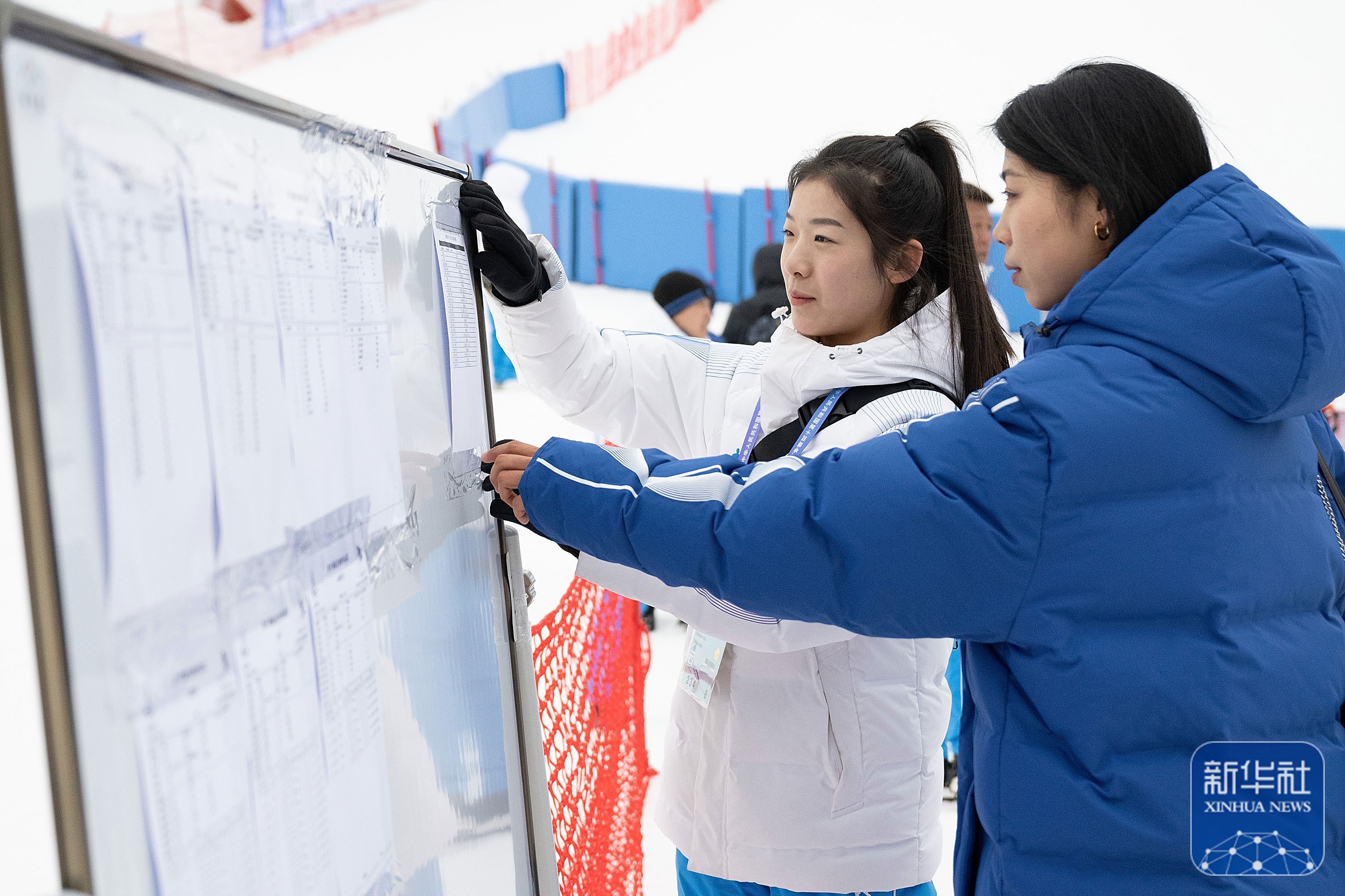 ↑2月18日,在扎兰屯赛区,竞赛服务志愿者在张贴赛事成绩单和日程表。新华社记者 谢剑飞 摄
