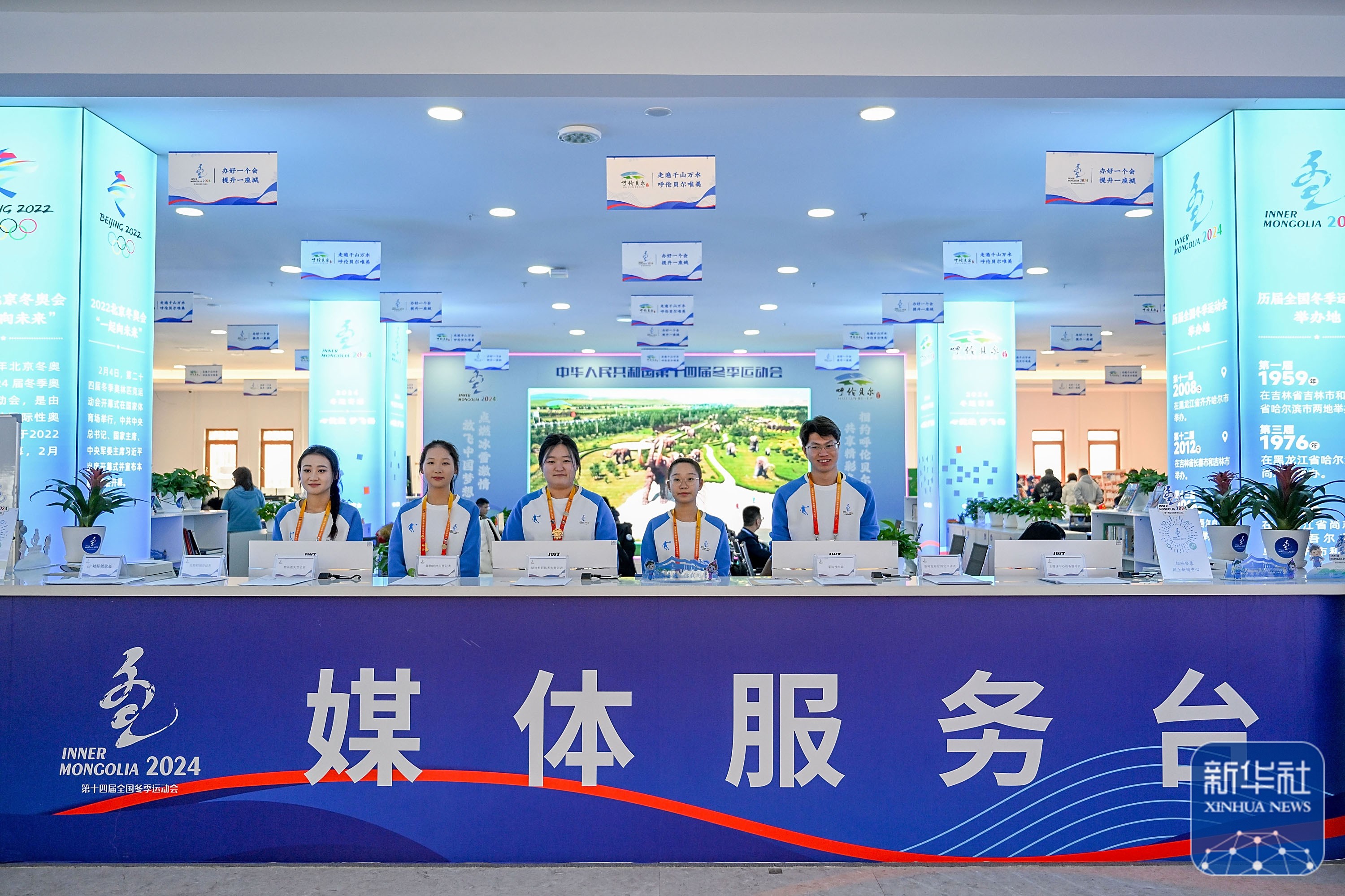 ↑2月18日,来自呼伦贝尔职业技术学院的志愿者阿娜尔(右一)向媒体记者提供赛程表。新华社记者 连振 摄