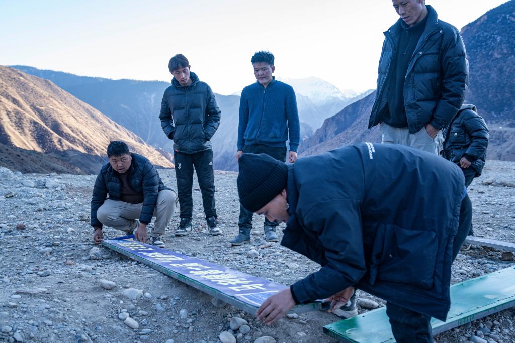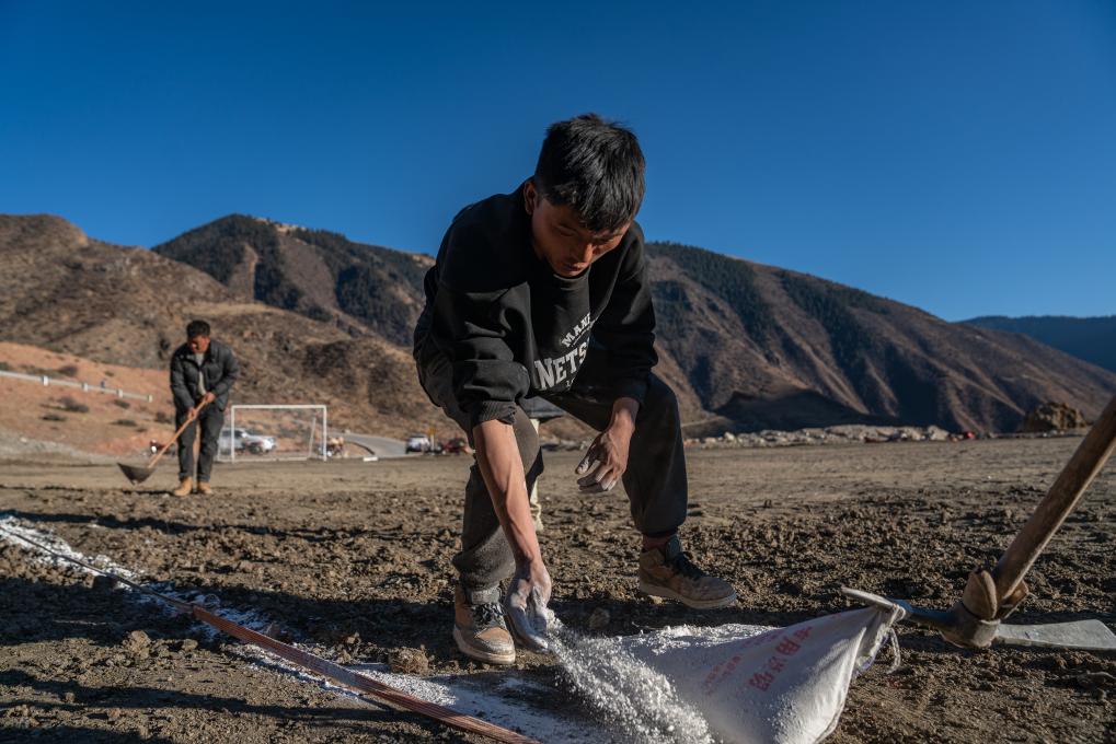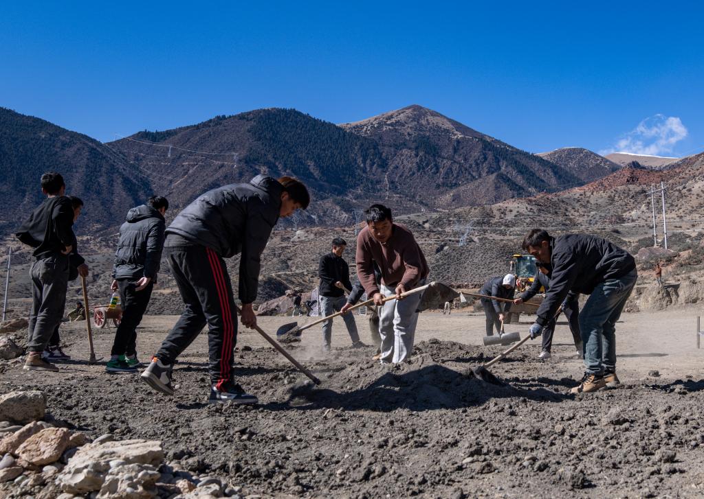 嘎玛群美(中)和球员们正在平整球场(1月20日摄)