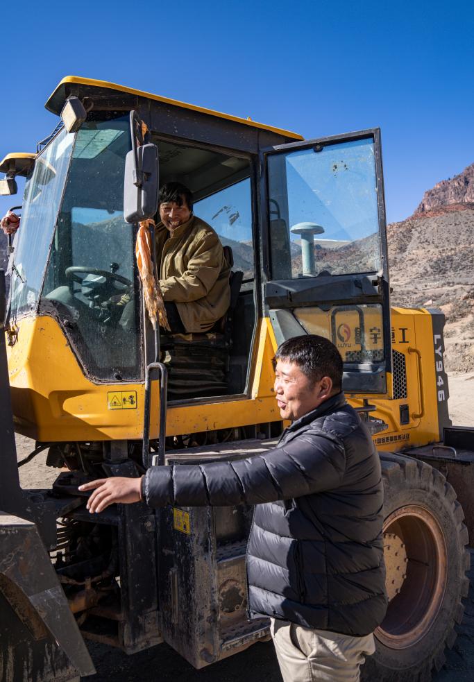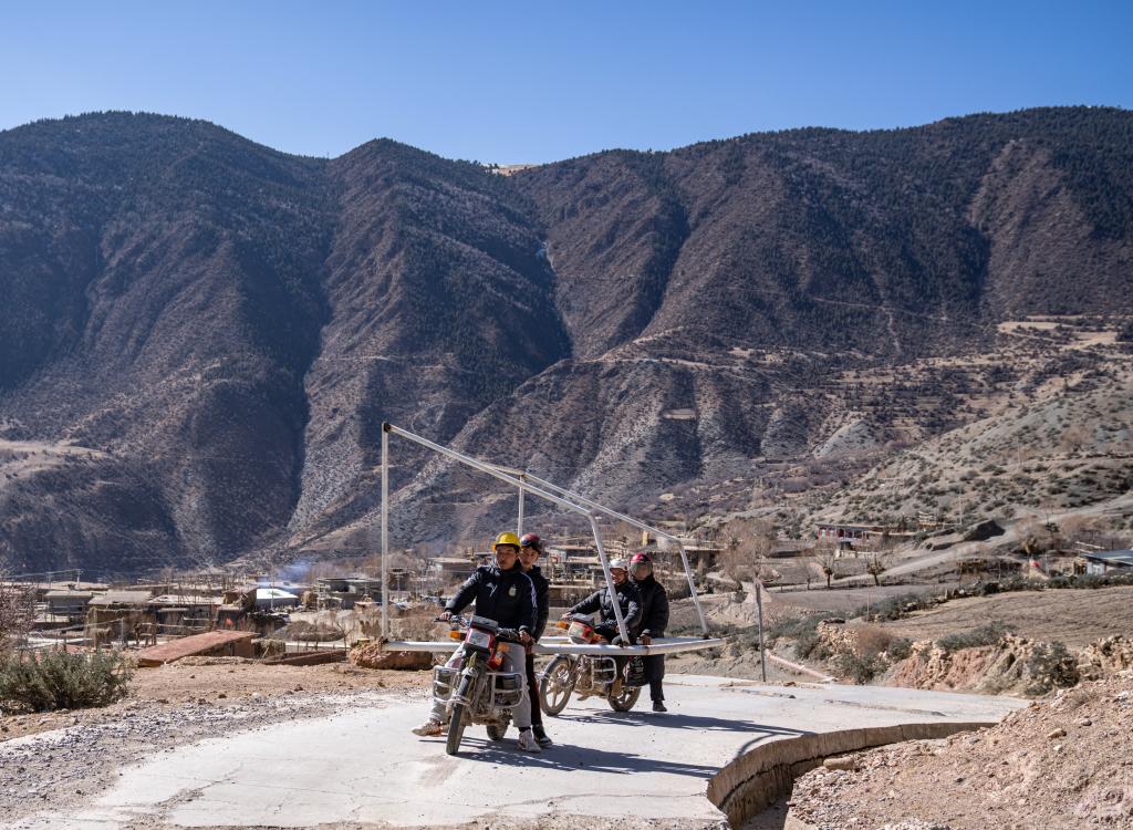 修好啦,嘎玛群美带着摩托车队驮着球门兴冲冲回村↑