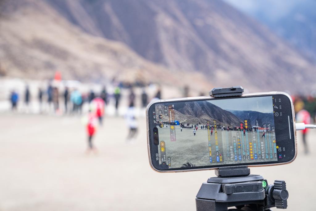 在马利村的足球场边,一名村民用手机直播比赛(1月21日摄)