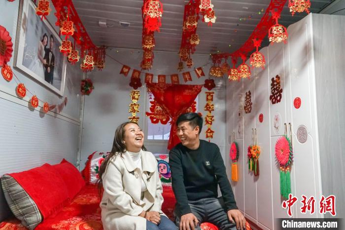 2月7日,喇相忠和新婚妻子在安置点“新房”内聊天。中新社记者 马铭言 摄