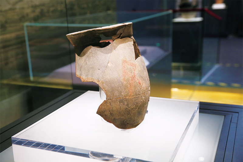 这件距今4000多年的陶扁壶上的“文”清晰可见。图为2023年6月28日拍摄的陶寺遗址出土的朱书陶扁壶(中国考古博物馆藏)。 中国历史研究院供图