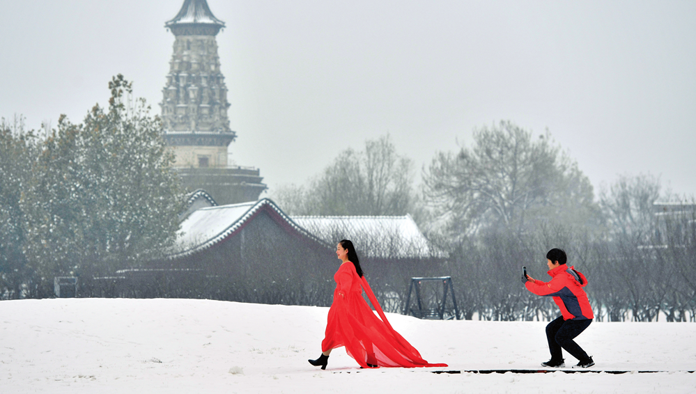 游客在正定古城雪景中拍照(2023 年 12 月 13 日摄)张晓峰摄