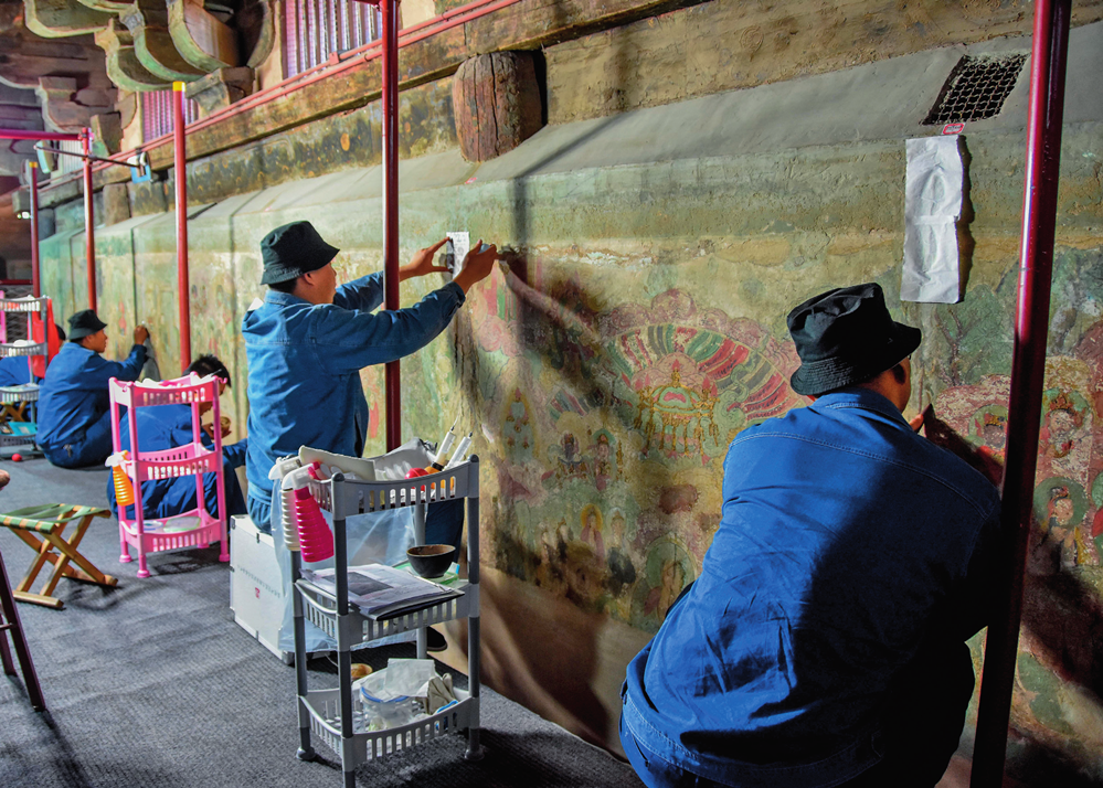 在正定隆兴寺摩尼殿内,专家在修缮壁画(资料照片)陈其保摄
