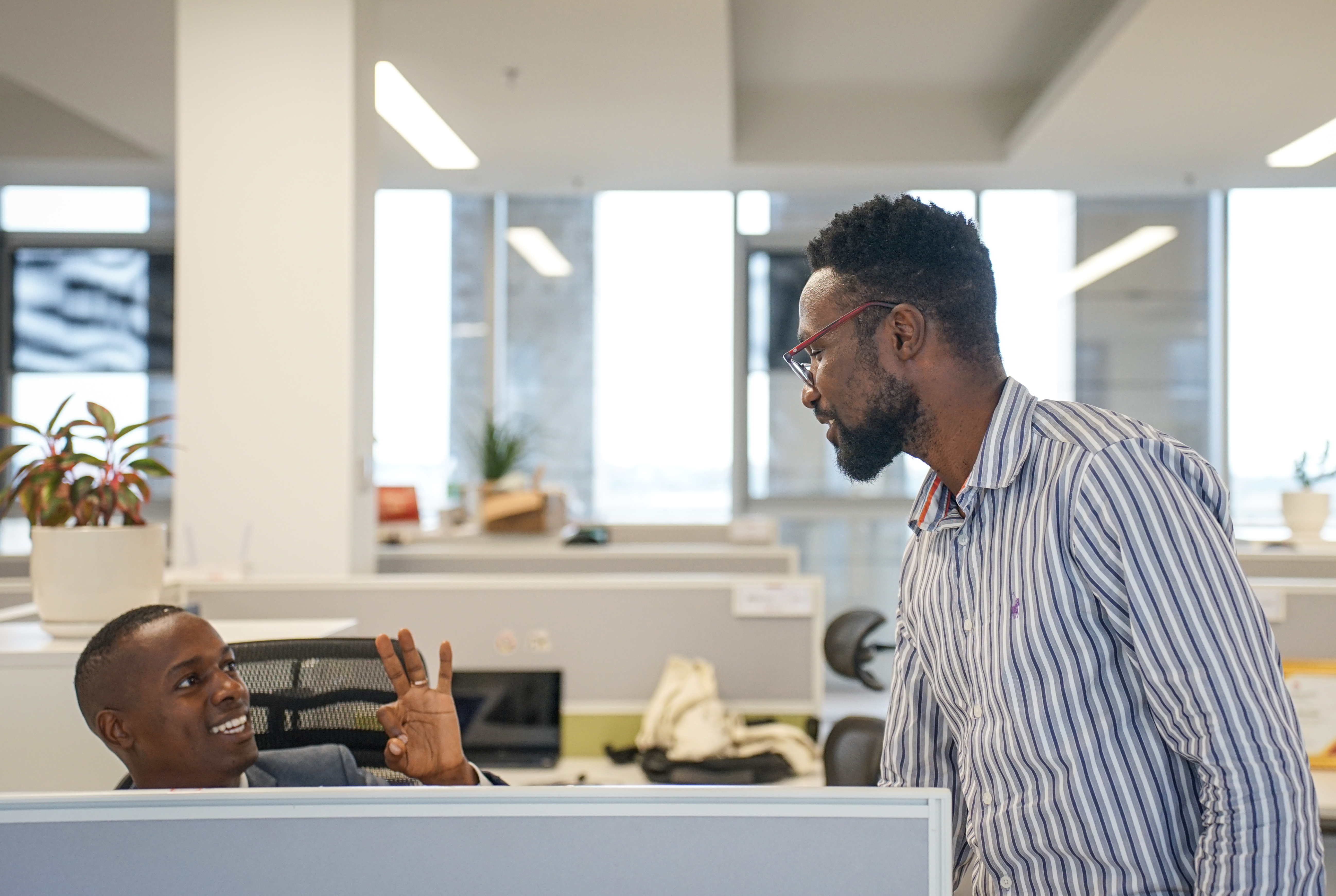 在安哥拉首都罗安达华为安哥拉科技园区,路易斯·埃里瓦尔多(右)和同事交谈。