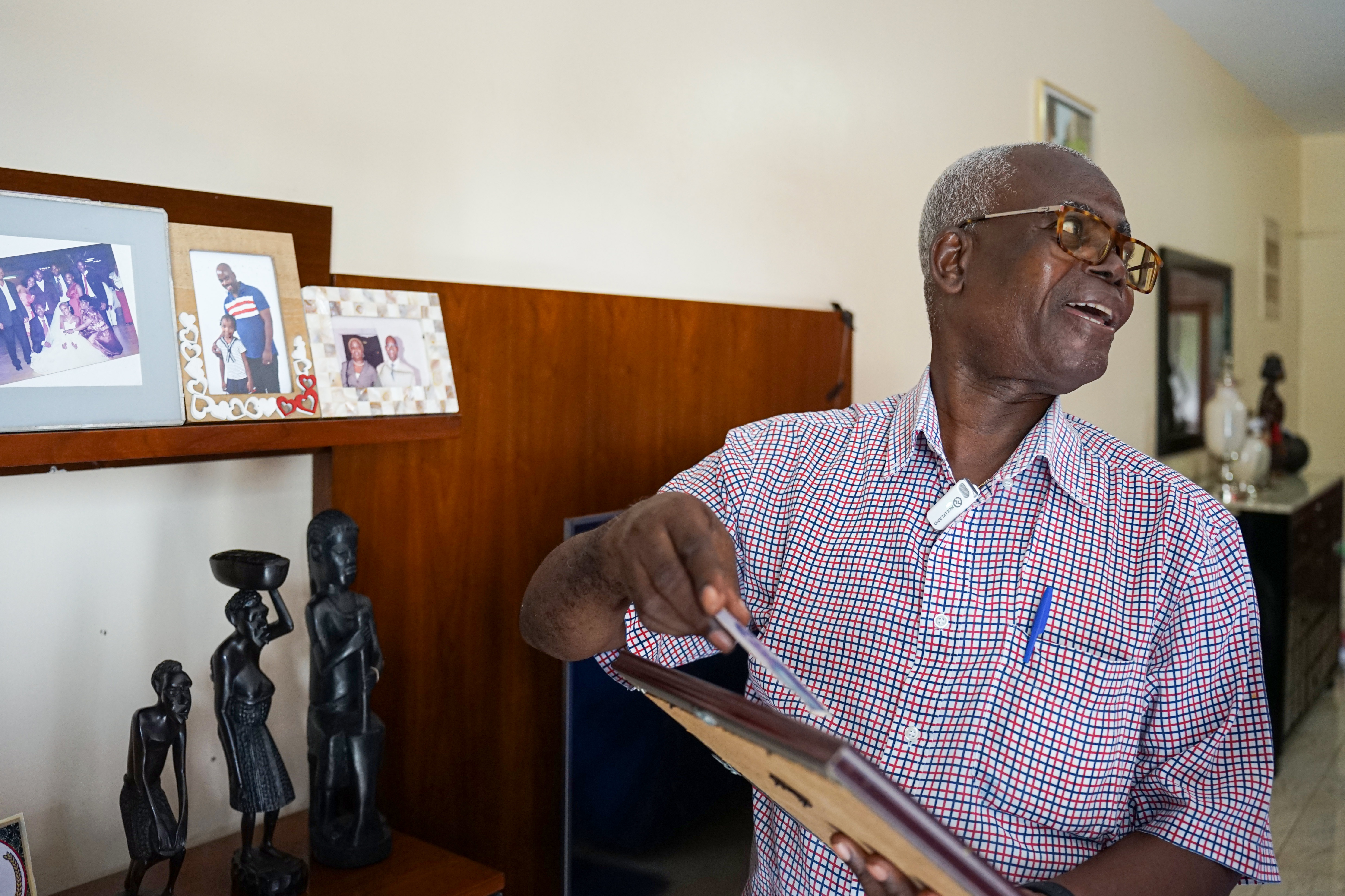 在安哥拉首都罗安达凯兰巴新城,加斯帕·佩德罗在家中向记者展示照片。