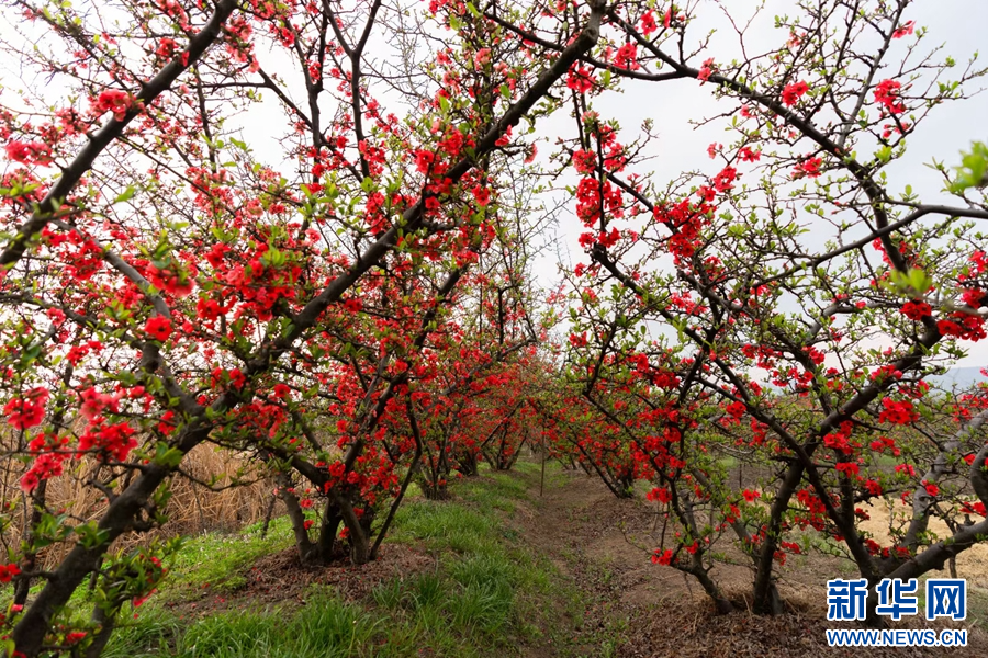 茈碧湖畔,一树树木瓜花娇艳似火(摄于3月26日)。新华网发(罗新才 摄)