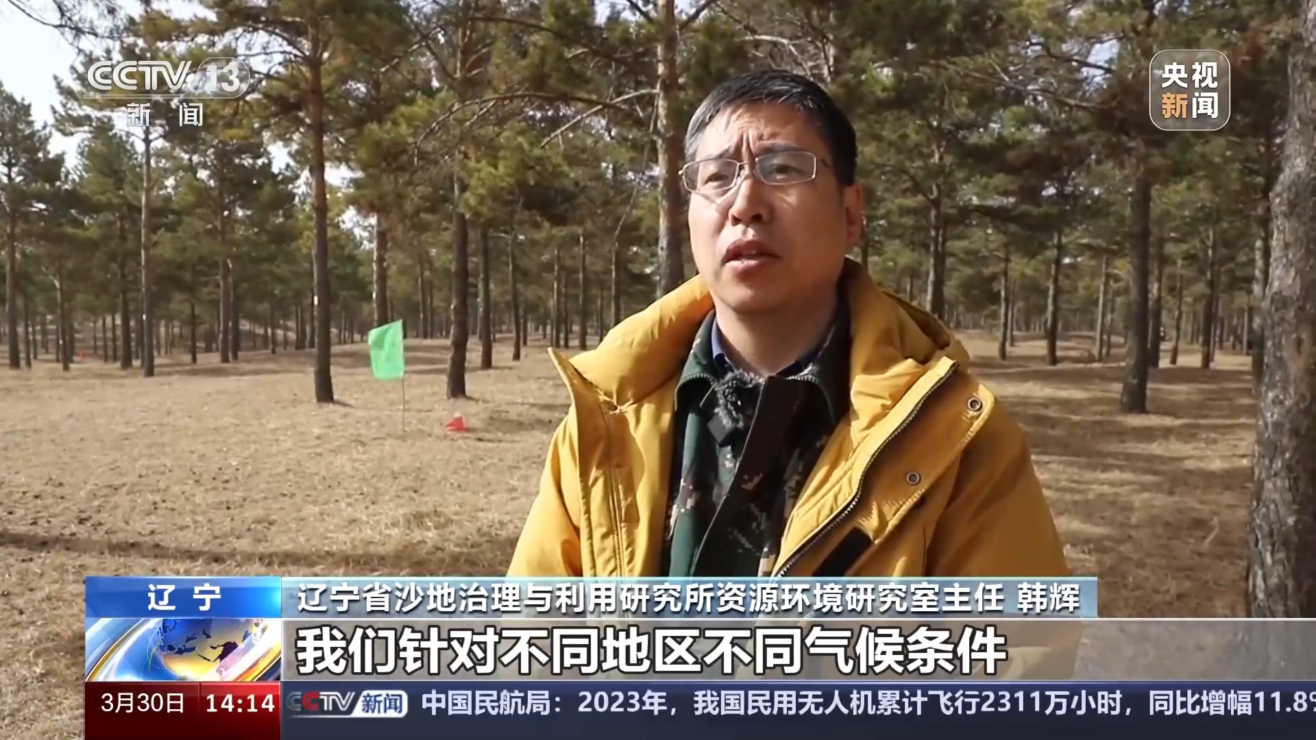 辽宁省沙地治理与利用研究所资源环境研究室主任 韩辉:我们针对不同地区不同气候条件,编制有针对性的树种选择方案,让不同的良种苗木在不同气候、土壤、沙化等地区能够生长并发挥生态效益,起到改善土壤质量、保持水土、防风固沙的作用,促进生态恢复和生物多样性发展。