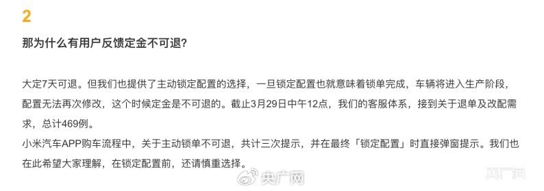 小米方面表示:“大定7天可退。但我们也提供了主动锁定配置的选择,一旦锁定配置也就意味着锁单完成,车辆将进入生产阶段,配置无法再次修改,这个时候定金是不可退的。截至3月29日中午12点,我们的客服体系,接到关于退单及改配需求,总计469例。小米汽车APP购车流程中,关于主动锁单不可退,共计三次提示,并在最终‘锁定配置’时直接弹窗提示。我们也在此希望大家理解,在锁定配置前,还请慎重选择。”