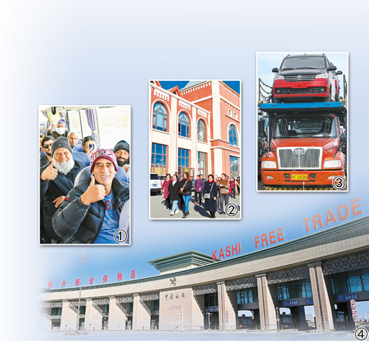 图①:新疆红其拉甫口岸,出境旅客在国际道路旅客班车上等待发车。新华社记者 丁 磊摄;图②:新疆巴克图口岸中哈边民互市丝路文化商品城。新华社记者 苟立锋摄;图③:新疆霍尔果斯公路口岸等待出口的车辆。新华社记者 赵 戈摄;图④:新疆喀什综合保税区。新华社记者 丁 磊摄