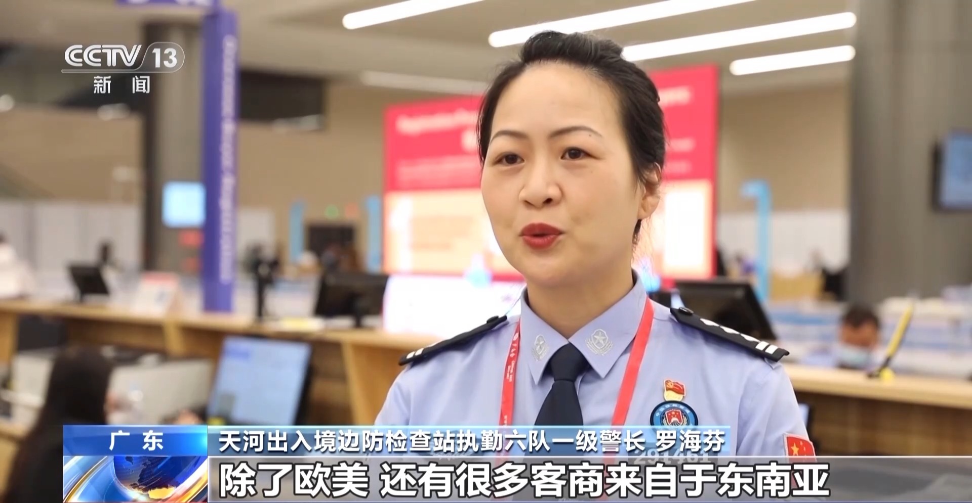 天河出入境边防检查站执勤六队一级警长 罗海芬:那个时候境外客商主要来自欧美等发达国家,现在我们看到,除了欧美,还有很多客商来自东南亚、中东、拉美、东欧等新兴市场,感觉广交会的“朋友圈”越扩越大,中国开放的大门也越来越大。