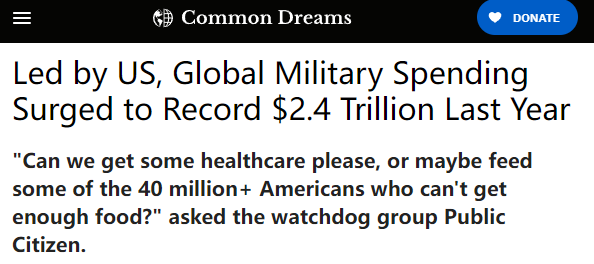 在美国共同梦想网站(Common Dreams)22日的报道中,非营利性权益倡导组织“公共公民”(Public Citizen)在回应SIPRI的报告时表示:“我们能得到一些医疗保健服务吗?或者至少为无法获得足够食品的4000多万美国人提供一些食物?”这份报告显示美国去年占全球军费总支出的37%。对美国2023年军费开支的另一项分析发现,美国联邦可支配预算的62%用于军事化项目,只有不到一半的预算留给医疗保健、住房、营养援助、教育和其他国内优先事项。