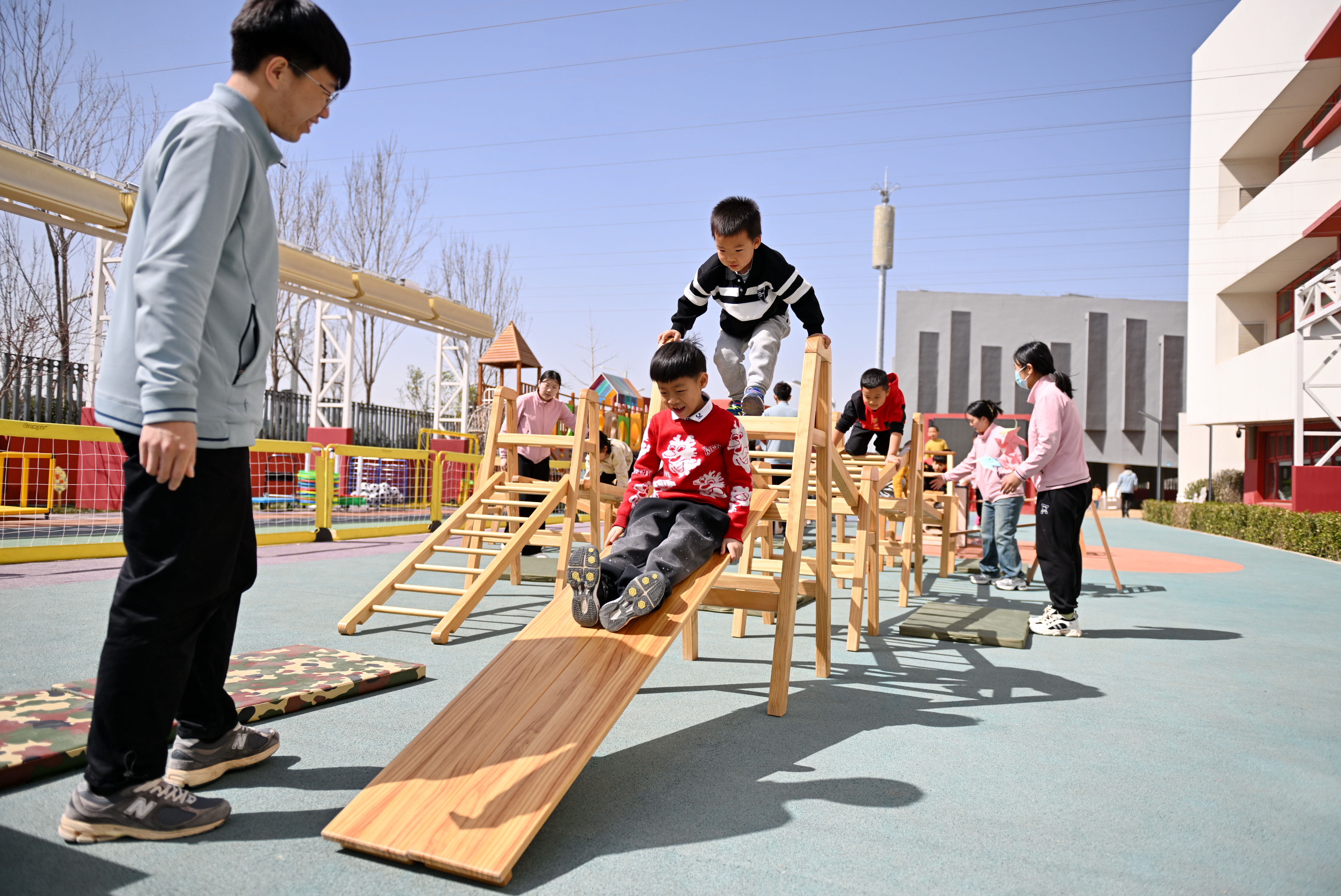 ↑3月29日,雄安北海幼儿园的孩子们在室外做游戏。