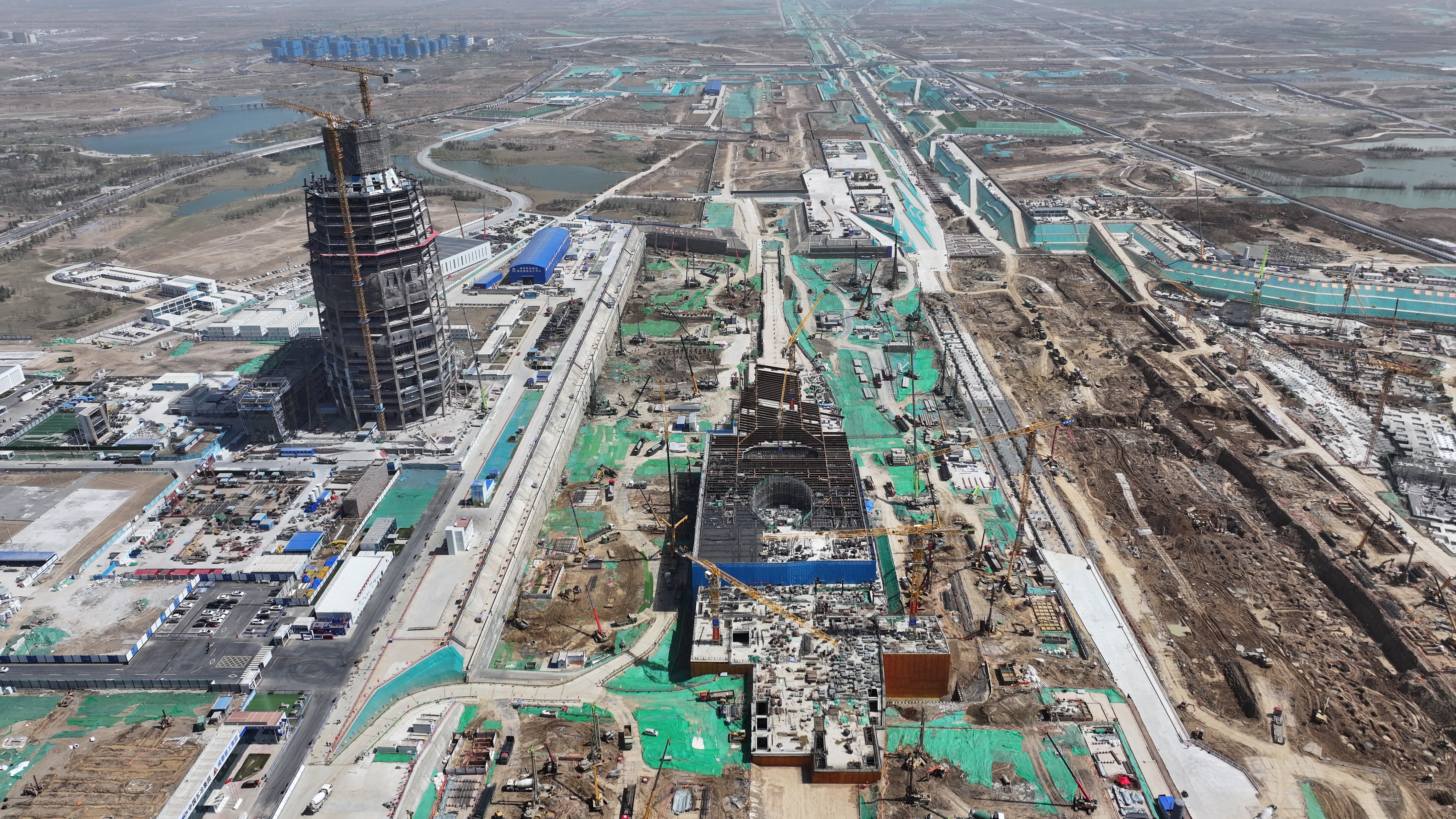 ↑这是位于雄安新区启动区内雄安城际站及国贸中心片区建设现场(3月29日摄,无人机照片)。