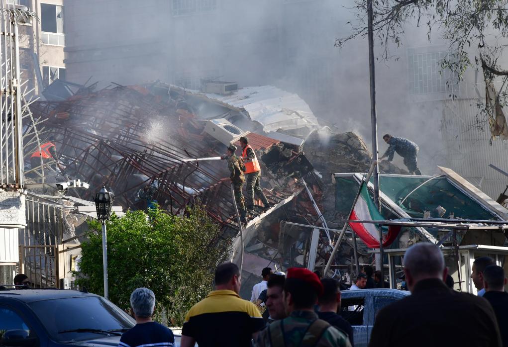 4月1日,在叙利亚首都大马士革,救援人员在伊朗驻叙使馆遭袭现场搜救。新华社发(阿玛尔摄)