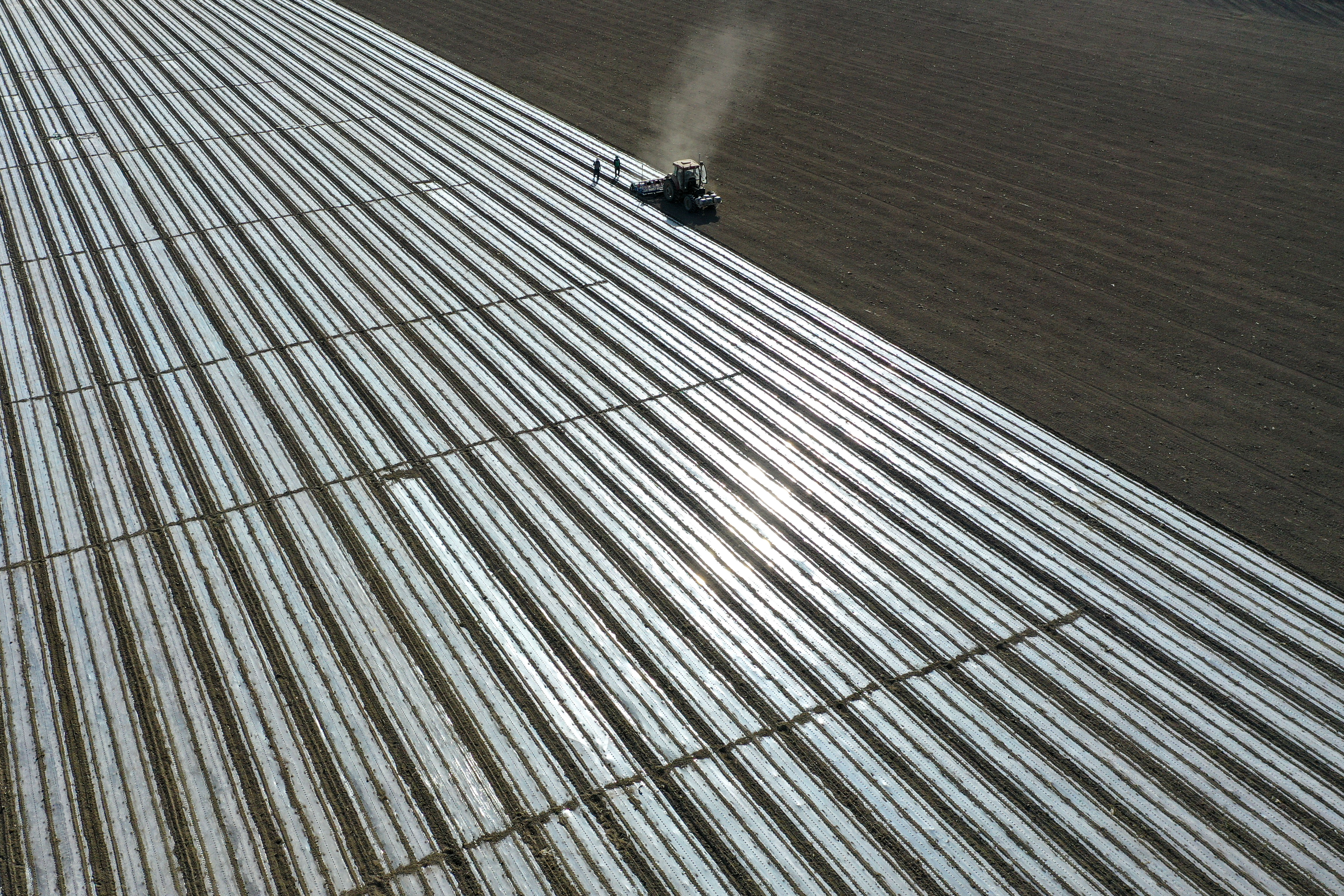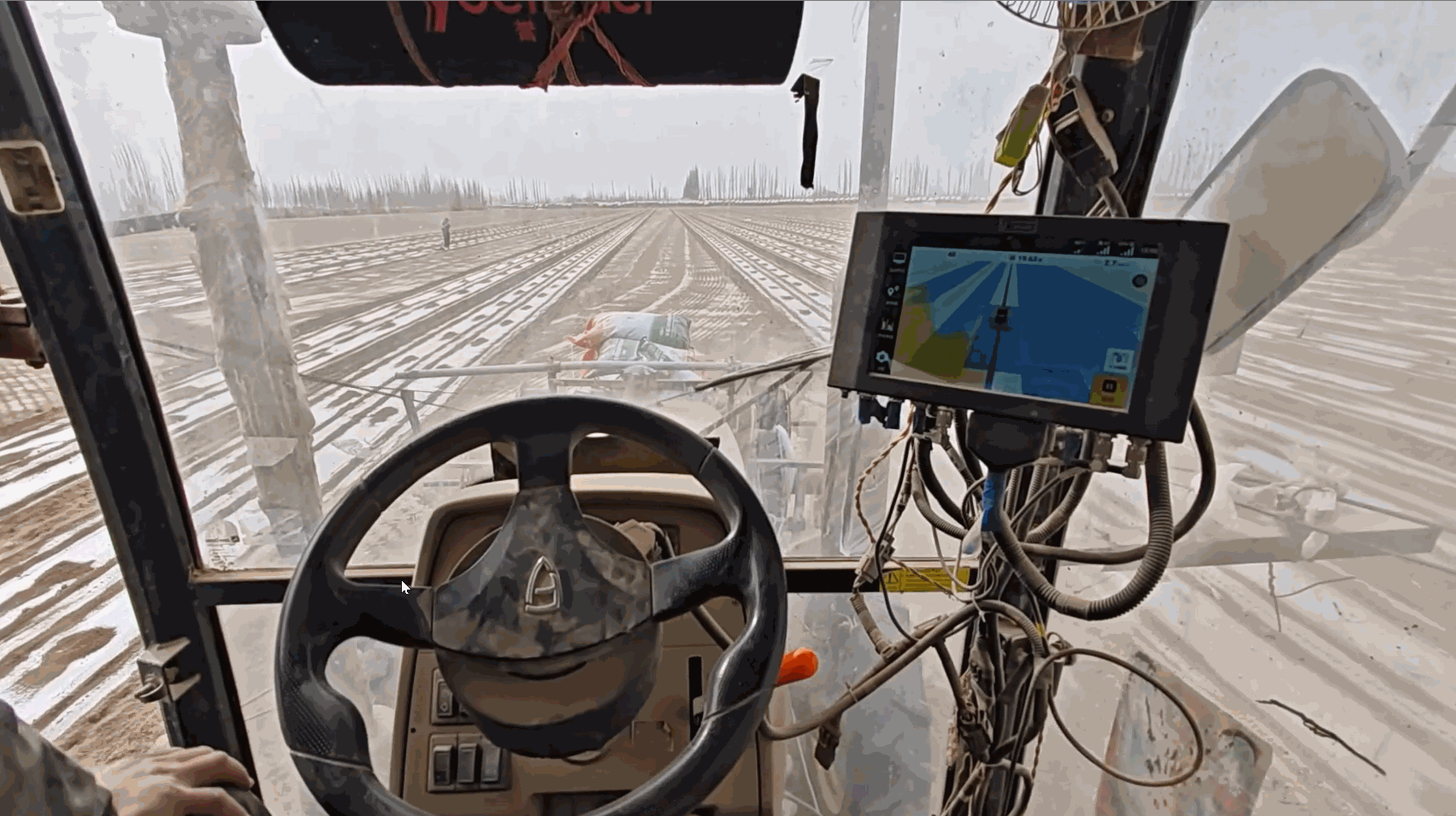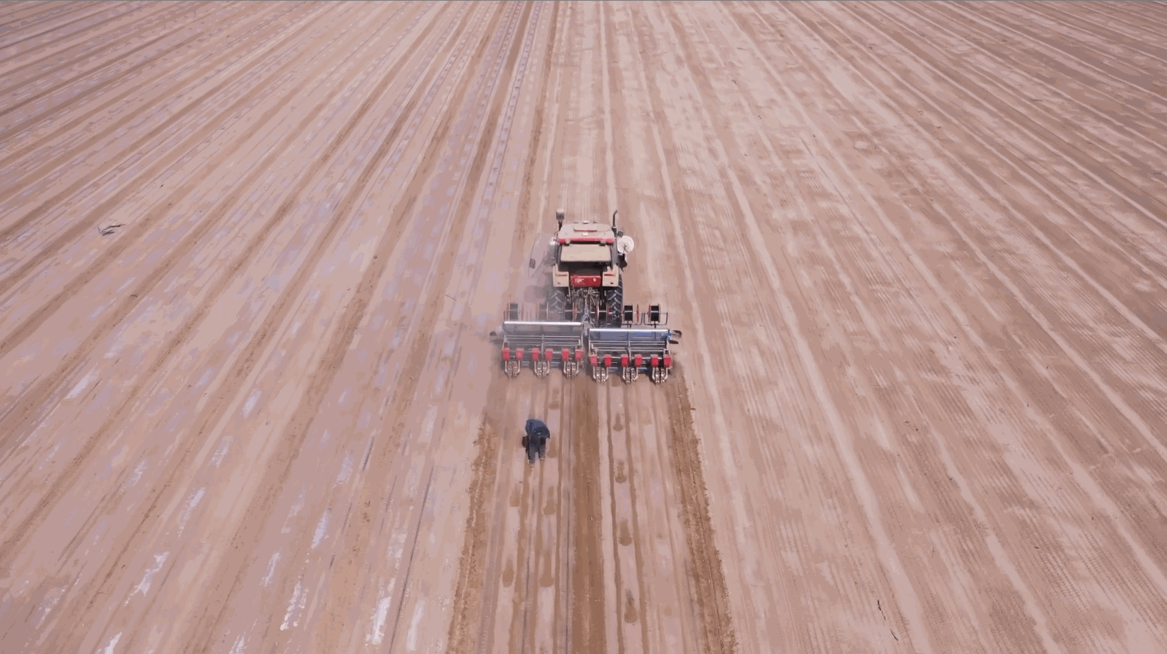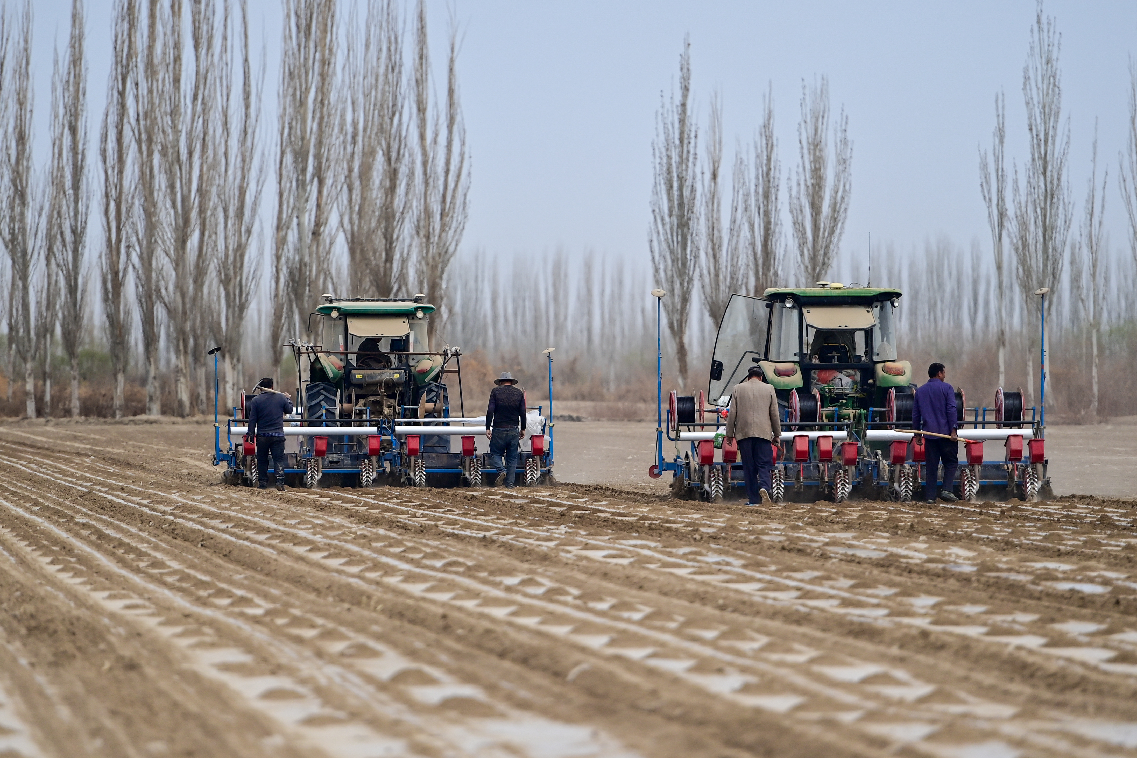 3月27日,在新疆阿克苏地区阿瓦提县高标准农田核心示范区,搭载导航自动驾驶系统的精量播种机在棉田春播。新华社记者 丁磊 摄
