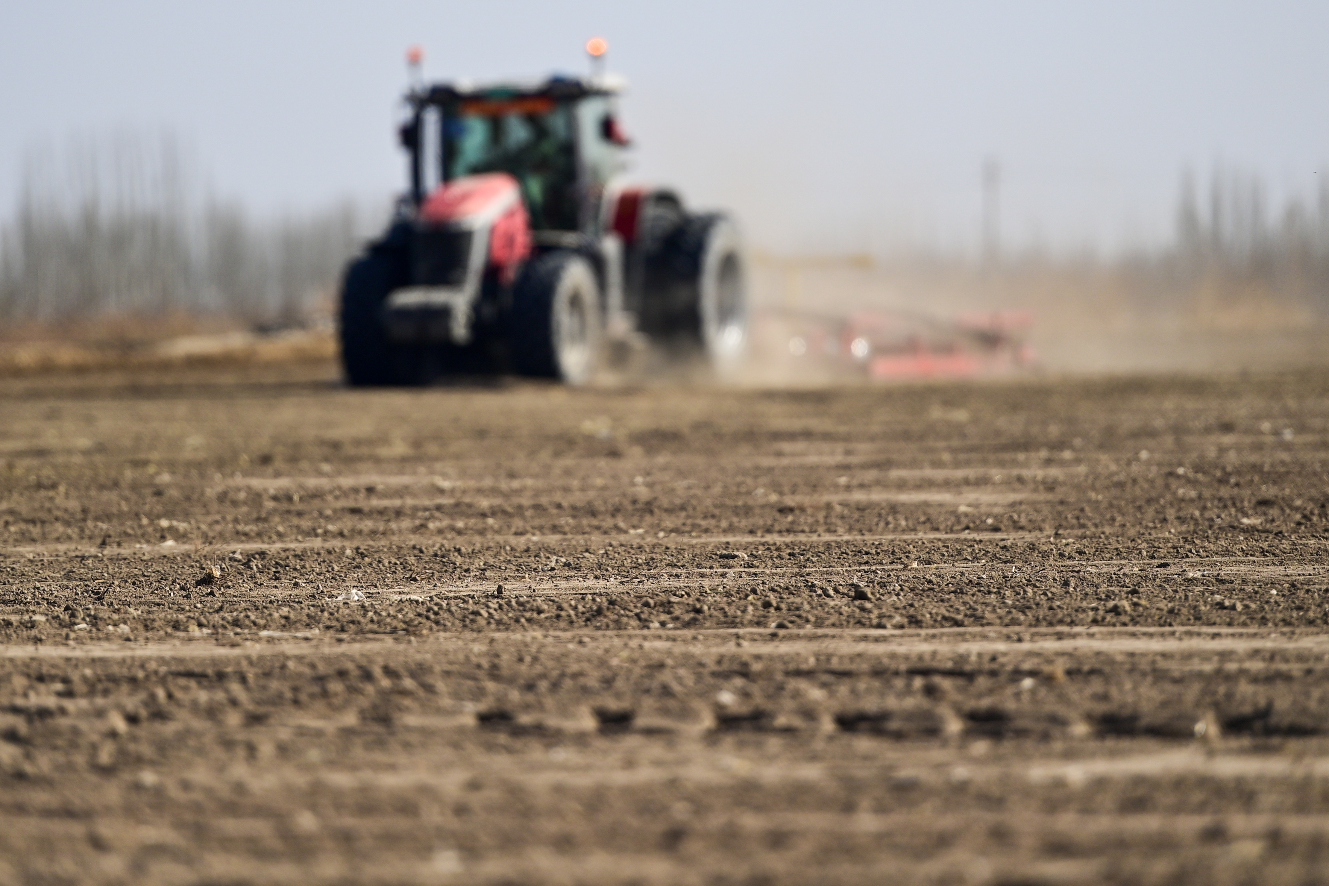 3月26日,在新疆阿克苏地区阿瓦提县阿依巴格镇幸福村,棉农驾驶平地机在棉田作业。 新华社记者 丁磊 摄