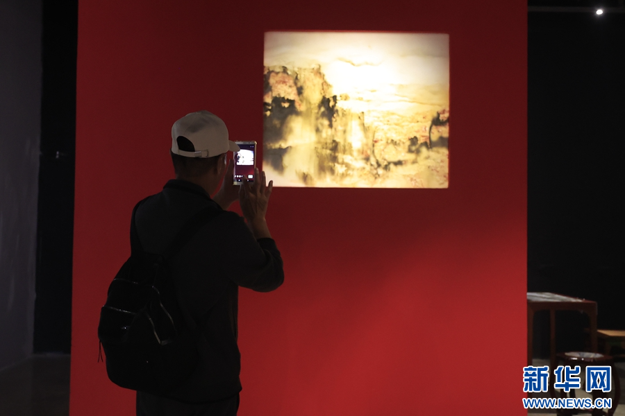 大理石方志馆里,一名游客正在观赏大理石画(摄于4月3日)。(新华网 赵普凡 摄)