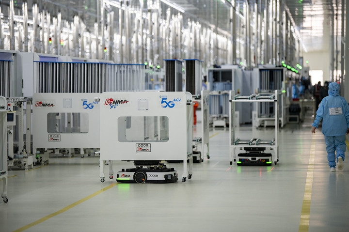 2024年1月10日,在位于浙江省金华市金义新区的润马光能集团金华工厂智能化生产车间里,AGV(自动导引运输)小车忙碌穿梭在生产单元之间。图源新华社