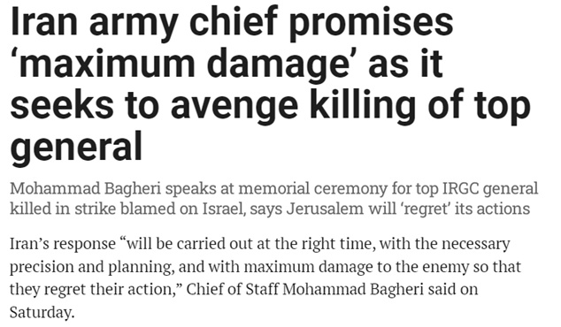 伊朗武装部队总参谋长穆罕默德·巴盖里6日表示,伊朗将在适当的时候做出回应,“以必要的精准度和规划给敌人造成最大程度的破坏,以便让他们对自己的行为感到后悔”。
