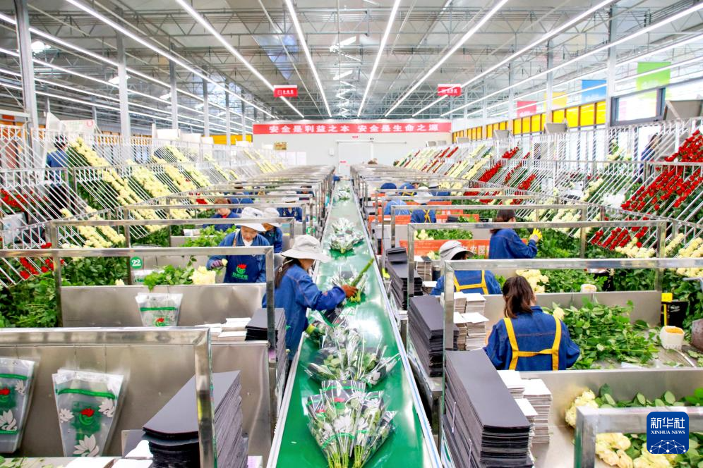 工人在甘肃临夏百益亿农国际鲜花港玫瑰工厂包装玫瑰(2023年8月15日摄)。新华社发
