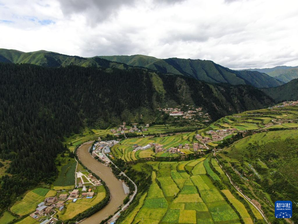 青海省果洛藏族自治州班玛县境内拍摄的村庄景色(2021年8月7日摄,无人机照片)。新华社记者 张龙 摄