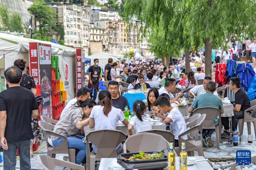 在重庆市巫溪县大宁河畔,游客和市民在品尝巫溪烤鱼(2023年6月19日摄)。新华社记者 黄伟 摄