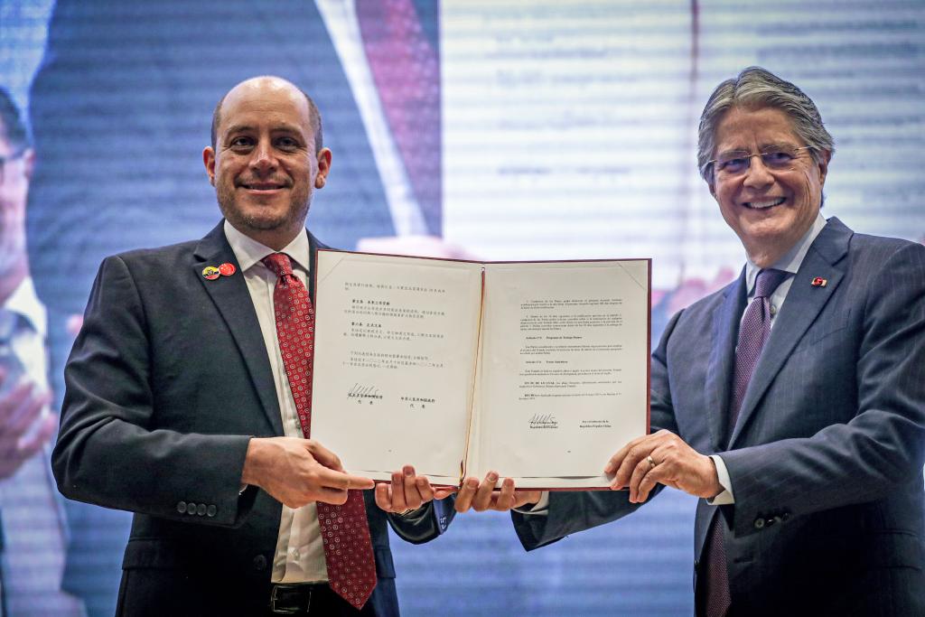 2023年5月10日,厄瓜多尔总统拉索(右)与厄瓜多尔生产、外贸、投资和渔业部部长普拉多在厄瓜多尔基多展示中厄自贸协定文件。新华社发(厄瓜多尔总统府供图)