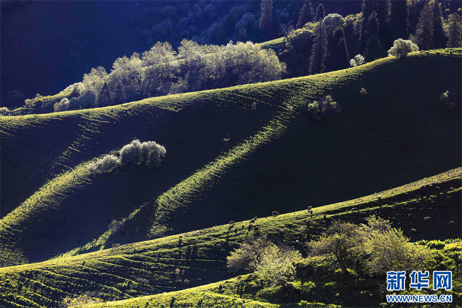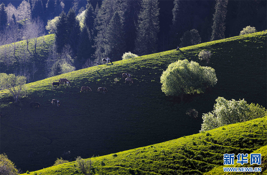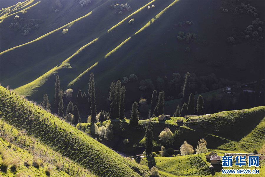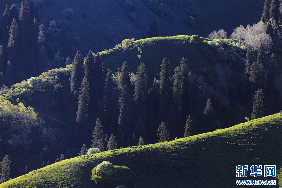 5月的新疆那拉提草原绿草如茵,繁花盛放,生机勃勃。清晨的光线照射在那拉提起伏的山体脊梁上,汇聚成神奇的光与影的世界,阳光勾画出山体草甸轮廓,线条柔美,层次分明。山梁与山脊、草木披上金色长袍,为绵延起伏的草甸增戴上神秘面纱,一幅美丽的画卷展现在眼前,令人陶醉。