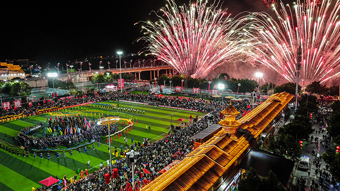 在贵州省榕江县举行的2024全国“村晚”示范展示活动暨贵州“村超村晚”活动中,音乐烟花秀精彩上演。新华社记者 刘续 摄
