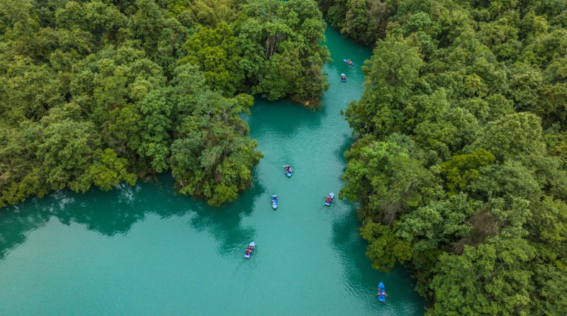游客在荔波县小七孔景区划船游玩(5月16日摄,无人机照片)。新华社记者 陶亮 摄