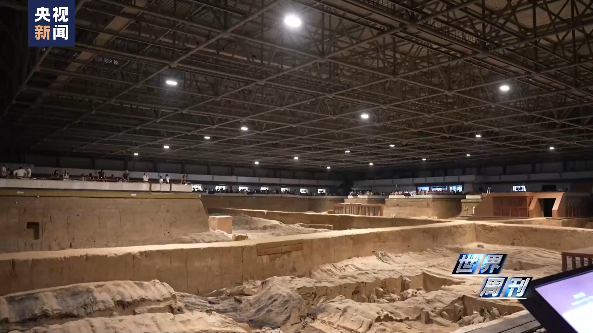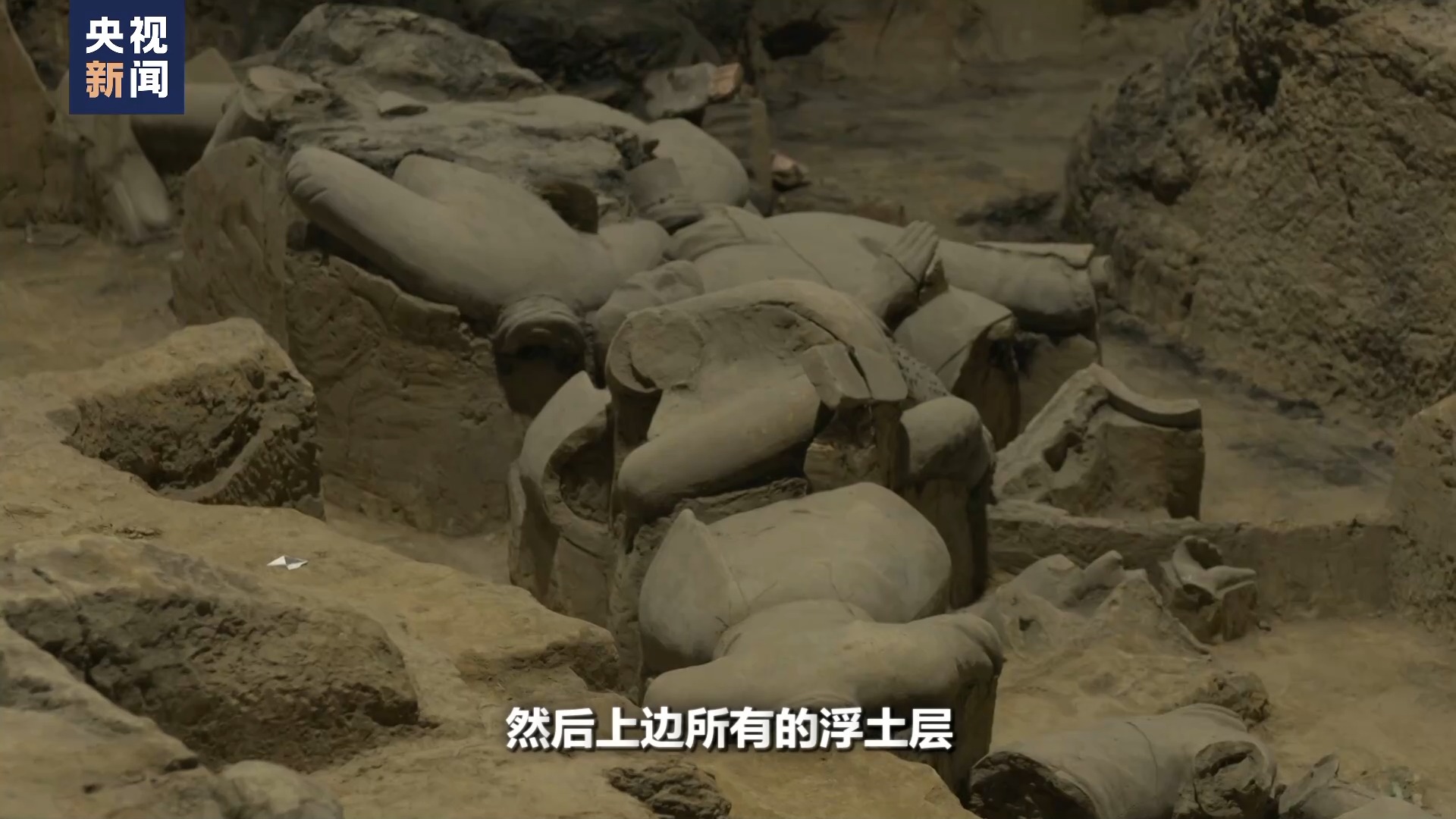 秦始皇帝陵博物院副院长 周萍:其实秦始皇帝陵博物院出土,不仅仅只有彩绘陶俑。现在观众去现场去看的时候,最常看到的就是几种材质,一种就是我们的彩绘陶俑,一种是坑内的土遗址,一种我们铜车马是金属文物;其实在土遗址里面,有很多很多这种木质的遗存。它这个就是我们这个隔梁在建的时候,实际上就相当于用木头去搭了一个相当于小房子,把这些彩绘俑保存在里面。