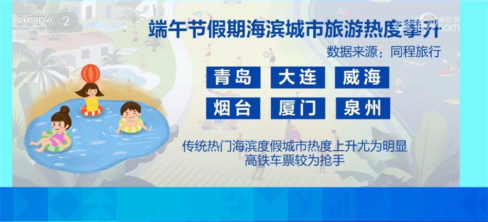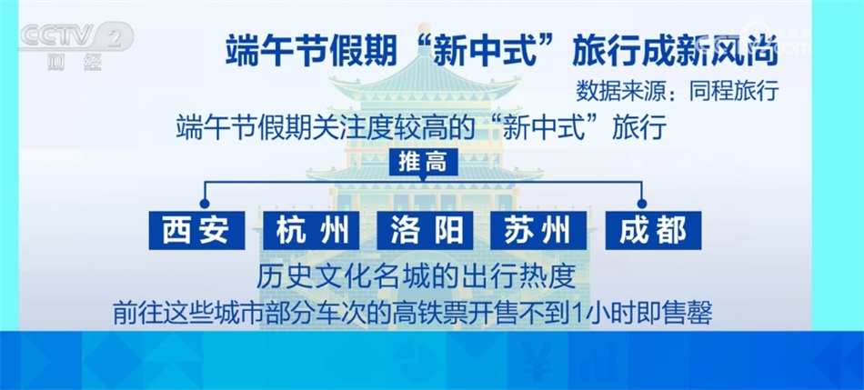 数据显示,端午假期旅游消费预订量较去年同期增长一倍,且仍在持续升温。端午假期关注度较高的“新中式”旅行推高了西安、杭州、洛阳、苏州、成都等历史文化名城的出行热度,前往这些城市部分车次的高铁票开售不到1小时即售罄。热门“新中式”旅行方式包括龙舟观赛、历史博物馆参观、非遗文化、汉服妆造等沉浸式体验。此外,随着气温升高,海滨海岛游成为端午假期的热门选择,青岛、大连、威海、烟台、厦门、泉州等传统热门海滨度假城市热度上升尤为明显,高铁车票较为抢手。