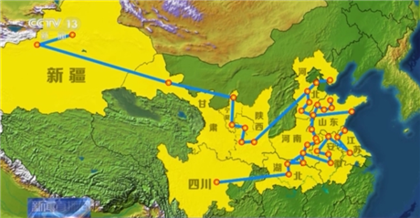 这张图是根据26.8万台装有北斗导航的联合收割机的常年作业数据绘制的小麦机收路线图。从图上能看到,小麦机收最早从西南地区开始,继而转向冀鲁豫苏皖等黄淮海麦区,最后奔向陕西、甘肃、新疆。
