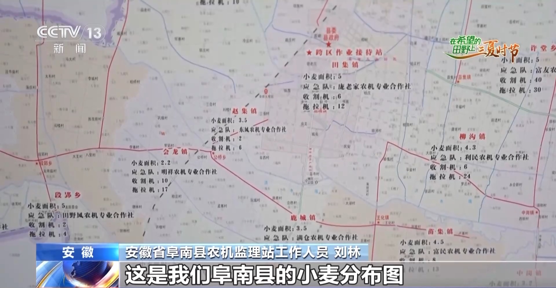 安徽省阜南县农机监理站工作人员 刘林:这是阜南县小麦分布图,第一次来这儿收麦,可以通过这个图对阜南的小麦有个简单的了解。这里还有给机手的一封信,信上有联系电话,可以通过电话了解各乡镇的小麦成熟情况、需不需要农机等,减少农机手的等待时间,提高小麦收割的进度。