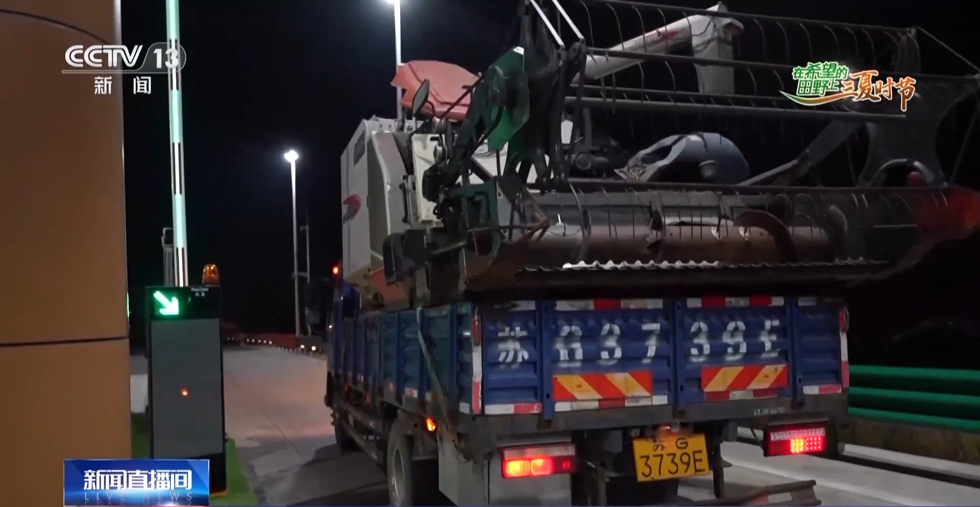收费站的工作人员介绍,在麦收大忙的季节,晚上的时间也很宝贵,因为这是联合收割机赶路的高峰期,这样不用耽误白天收割的时间。记者观察到,一台联合收割机通过收费站用时37秒,可以说是非常流畅、快速的。