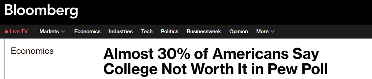 据彭博新闻社报道,一份最新调查报告显示,教育成本上升削弱了美国民众对大学价值的信心,美国有近30%的人认为大学学位失去价值。这项由皮尤研究中心发布的调查称,几乎一半的美国人认为,无需贷款上大学是值得的;只有22%的人认为,贷款上大学是值得的。