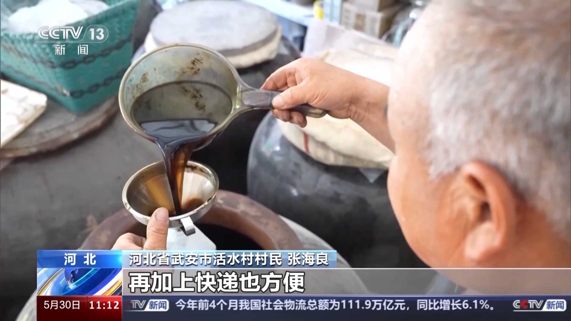 河北省武安市活水村村民 张海良:修好这条路以后,全国各地来旅游的人特别多。赶上礼拜六、礼拜日可以一天卖到1000多斤醋,再加上快递也方便,好多回头客直接在微信上下单,销量比以前翻了几番。