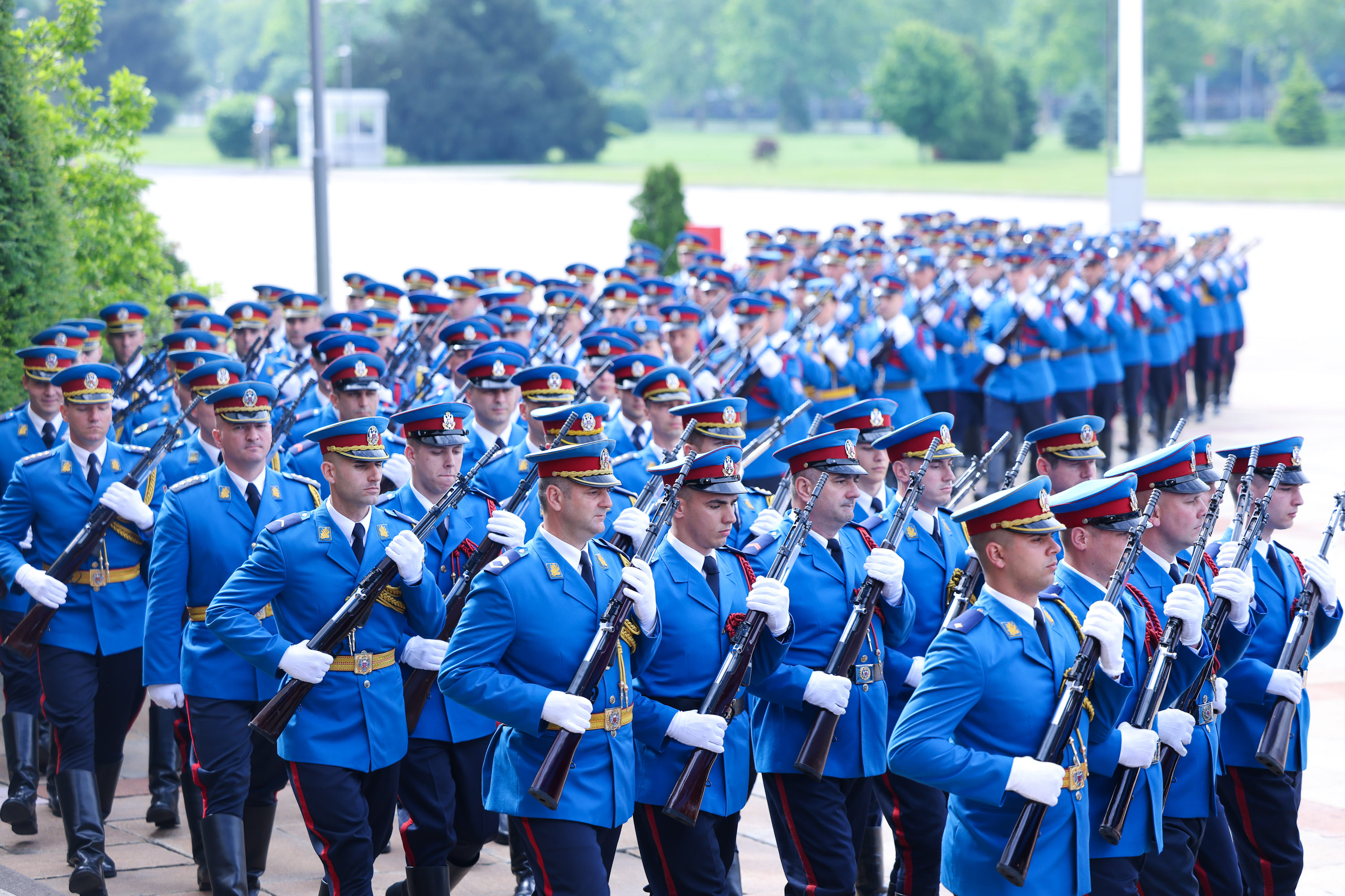 塞尔维亚大厦前,中塞两国国旗迎风飘扬,仪仗队威武雄壮。