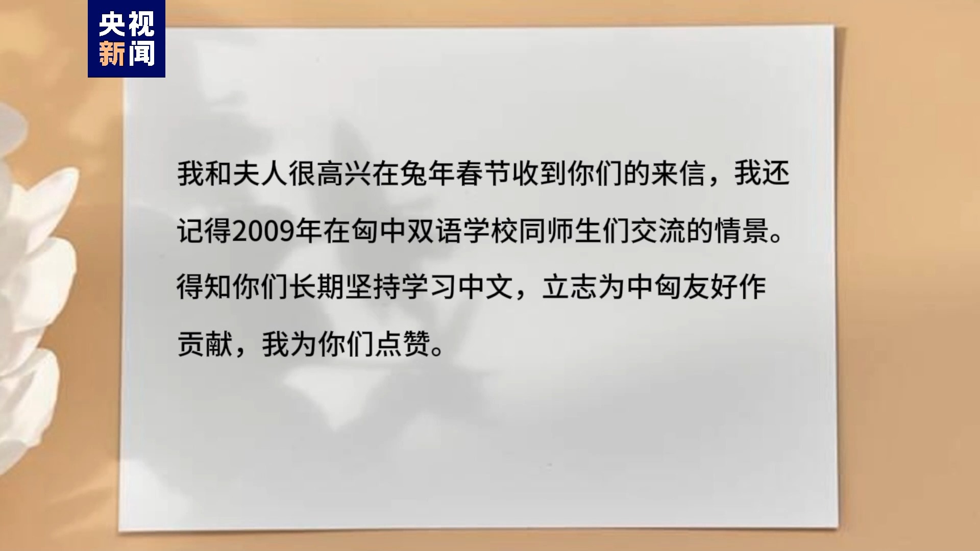 中国国家主席习近平在回信中写道,他和夫人为在兔年春节前收到同学们的来信而感到高兴,他还记得2009年在匈中双语学校同师生们交流的情景。得知孩子们长期坚持学习中文,立志为中匈友好作贡献,他为孩子们点赞。