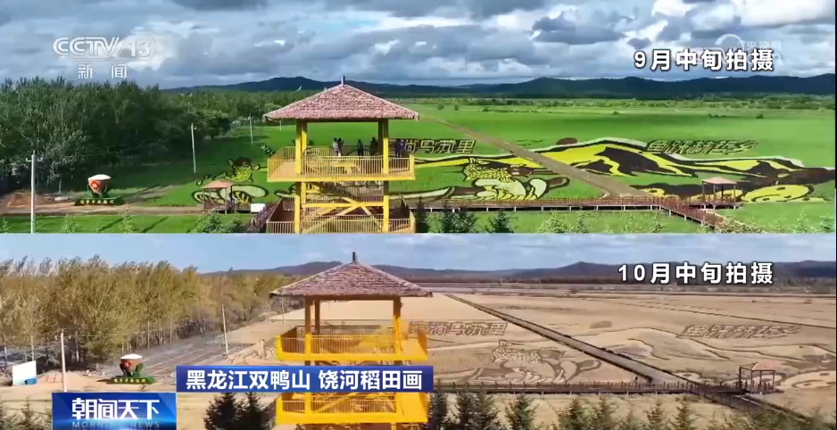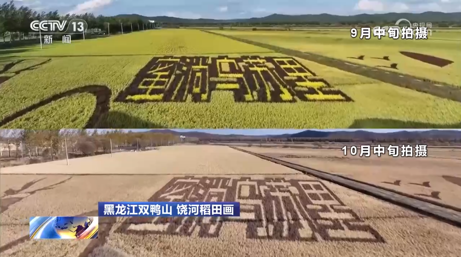 现在看到的绿色的稻田画是9月中旬记者在黑龙江省双鸭山市饶河县拍摄的,黄色的稻田画是10中旬同一地方拍摄。丰收前的稻田绿意盎然,稻叶挺拔、稻花清香、充满生机;即将迎来丰收的稻田稻穗垂挂,阳光下金光闪闪,田野如金色海洋般灿烂,美不胜收。